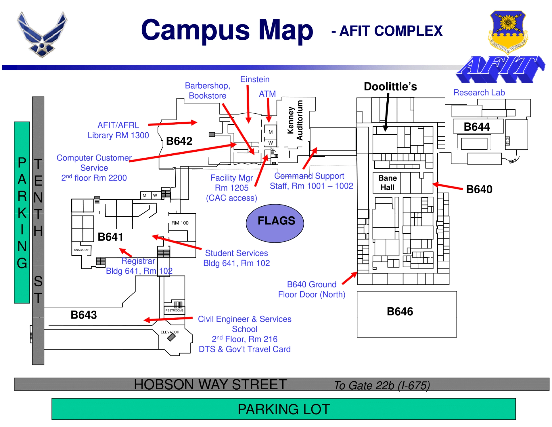 The campus is structured as a complex of numbered buildings, including B640, B641, and B642. Central landmarks are the FLAGS near Bane Hall and the AFIT/AFRL Library. Key support offices like the Registrar and Student Services are in Building 641.