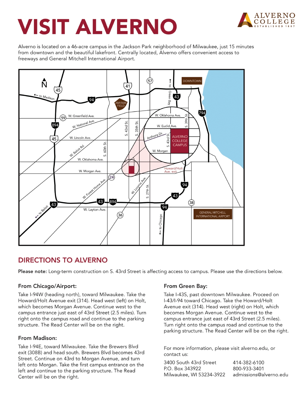 Alverno College is located in Milwaukee, 15 minutes from downtown and near General Mitchell International Airport. The campus is accessible from I-94 and I-43. Due to construction on S. 43rd Street , visitors from Chicago or Green Bay should exit at Howard/Holt Avenue and proceed west on Morgan Avenue to the campus entrance.