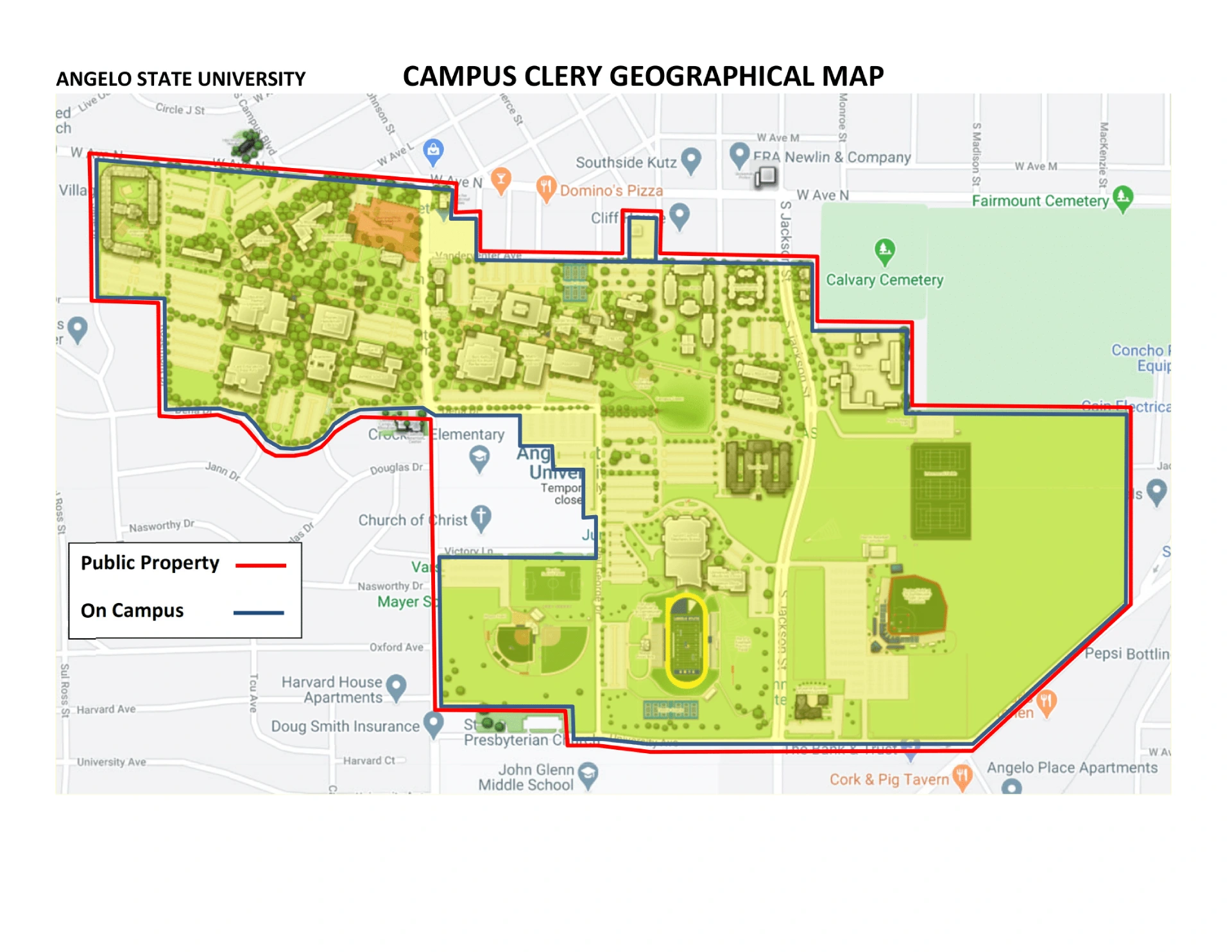 This map outlines the official Clery geographical boundaries for Angelo State University. It helps users navigate the main academic core, residential zones like Villa , and athletic fields.