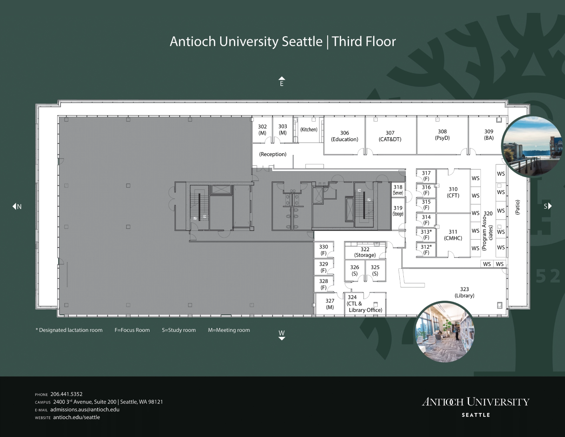 This map provides a comprehensive overview of the Antioch University Seattle campus, which spans the second and third floors. Use it to find administrative offices, classrooms, and student-focused areas.