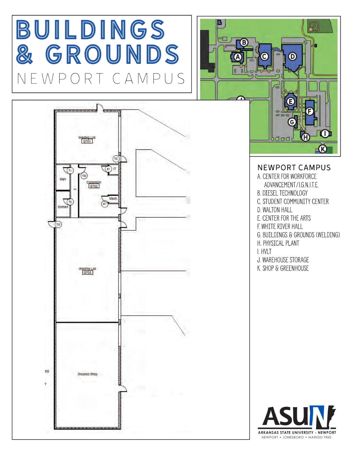 The Arkansas State University Newport Campus is easily accessible by car. Main campus roads connect all buildings, from the Center for Workforce Advancement (Building A) in the north to the HVLT building (Building I) and Shop & Greenhouse (Building K) in the southeast.