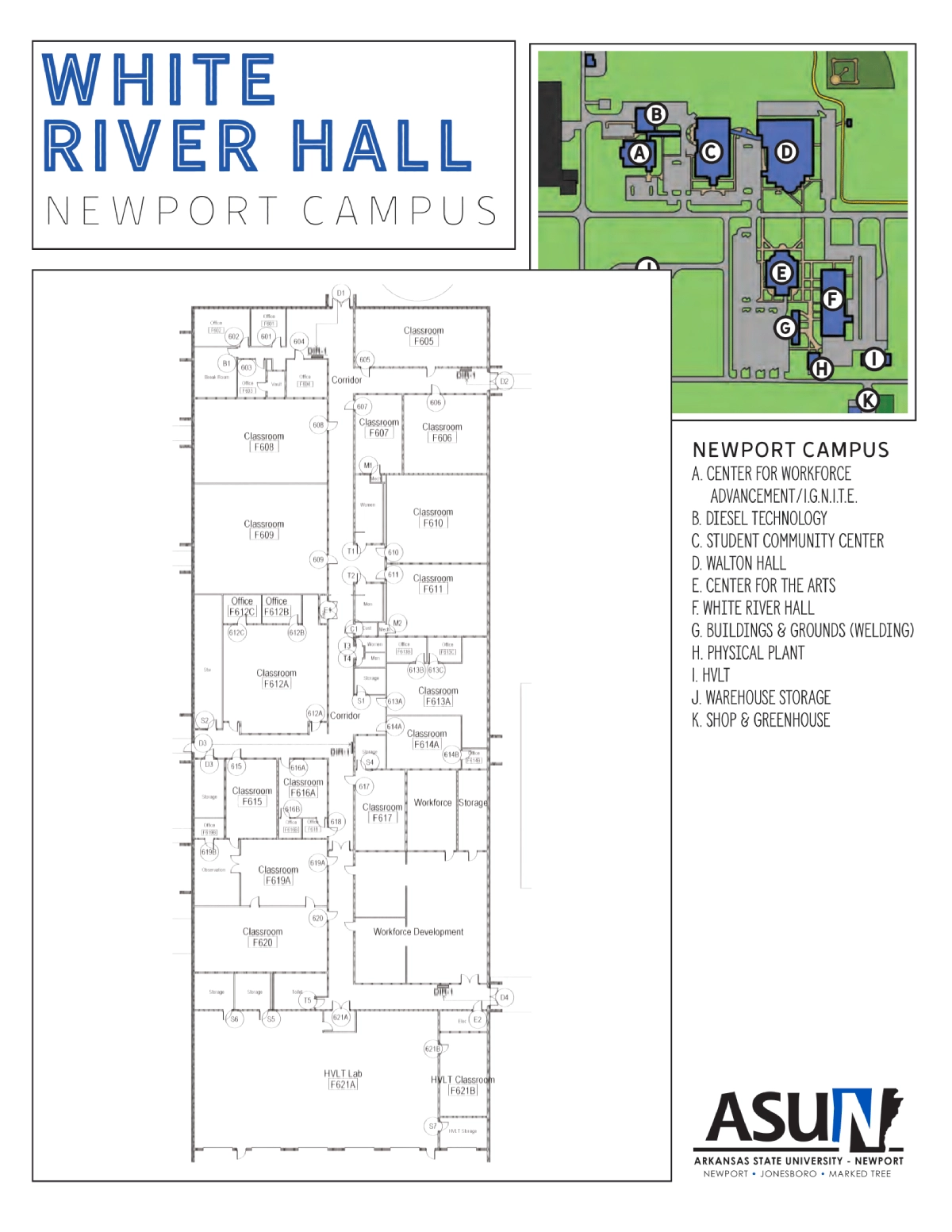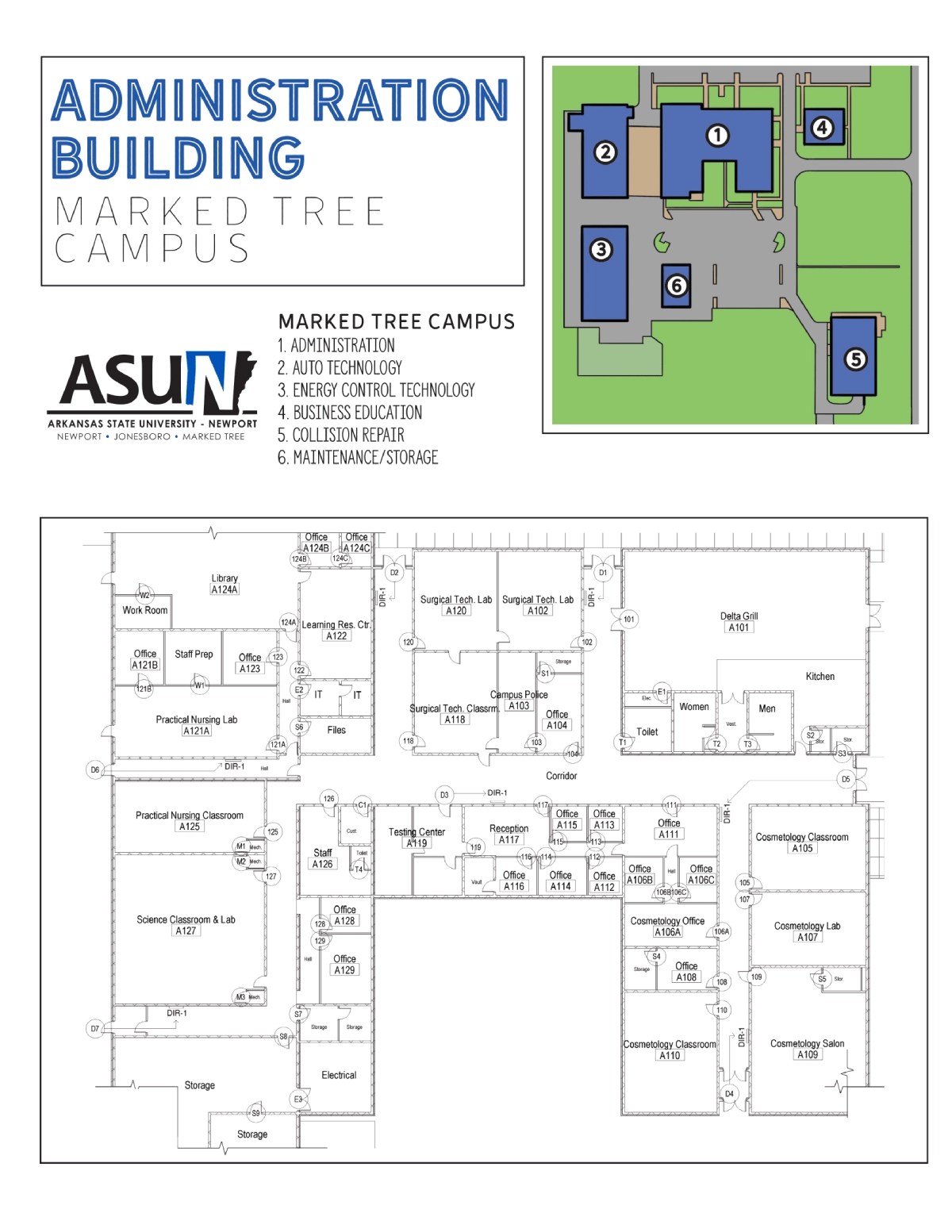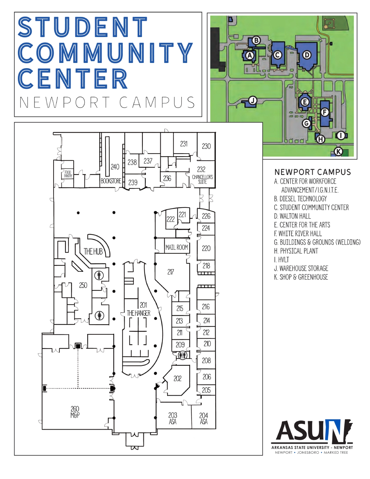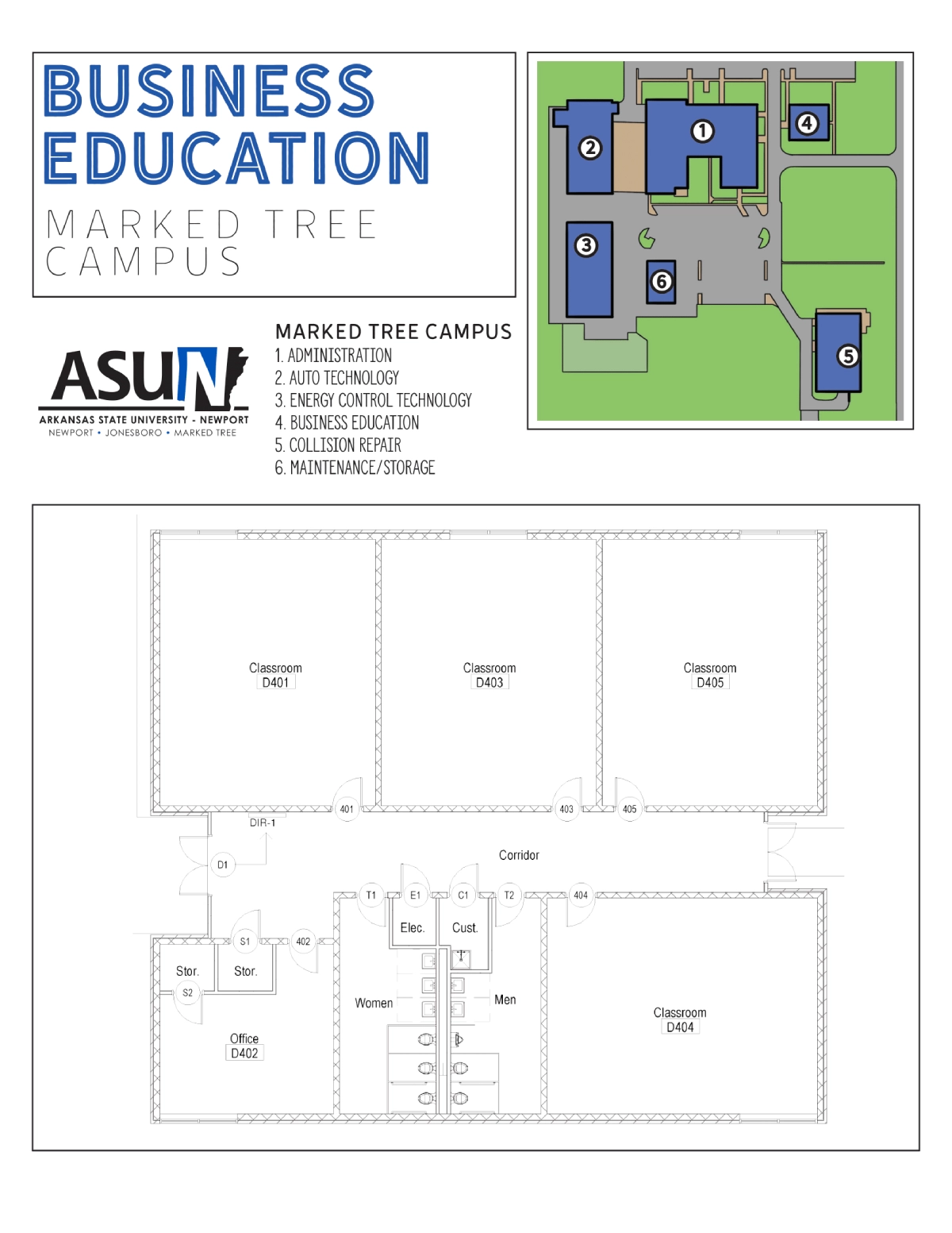 ASUN operates locations in addition to the main Newport campus. The maps below provide specific layouts for the Jonesboro and Marked Tree sites.