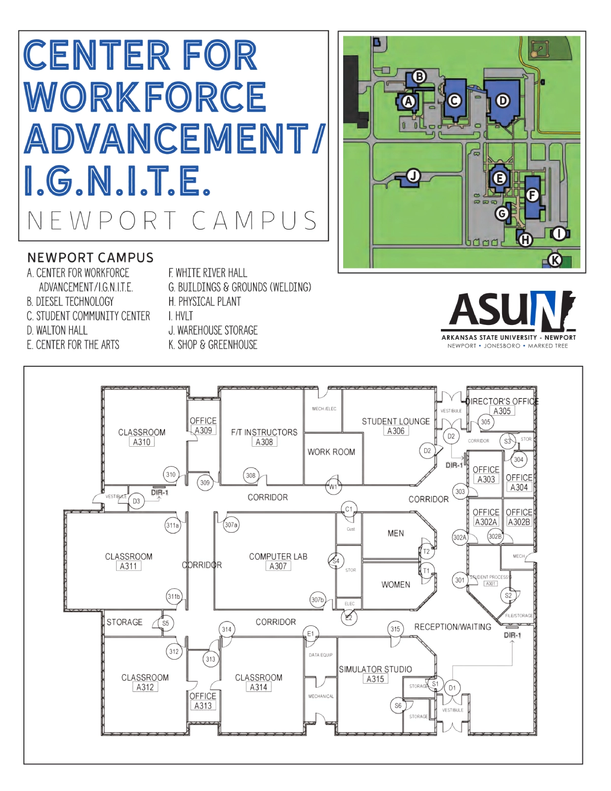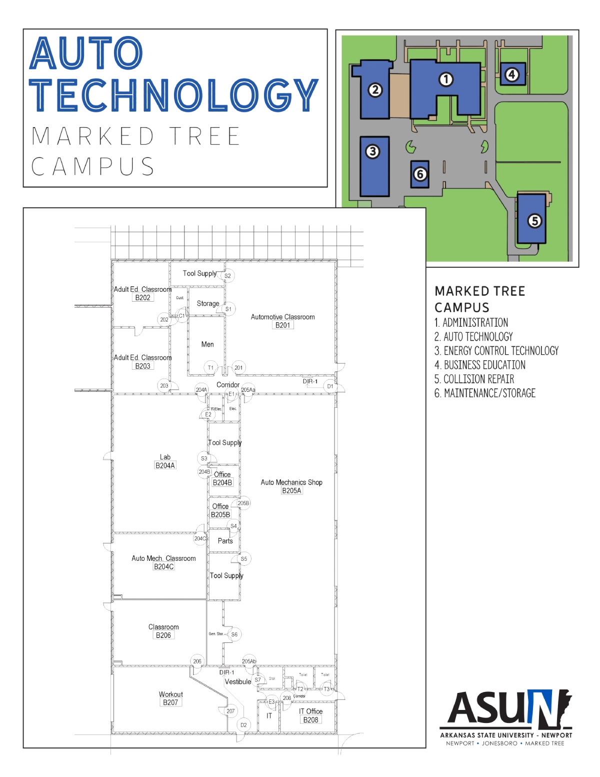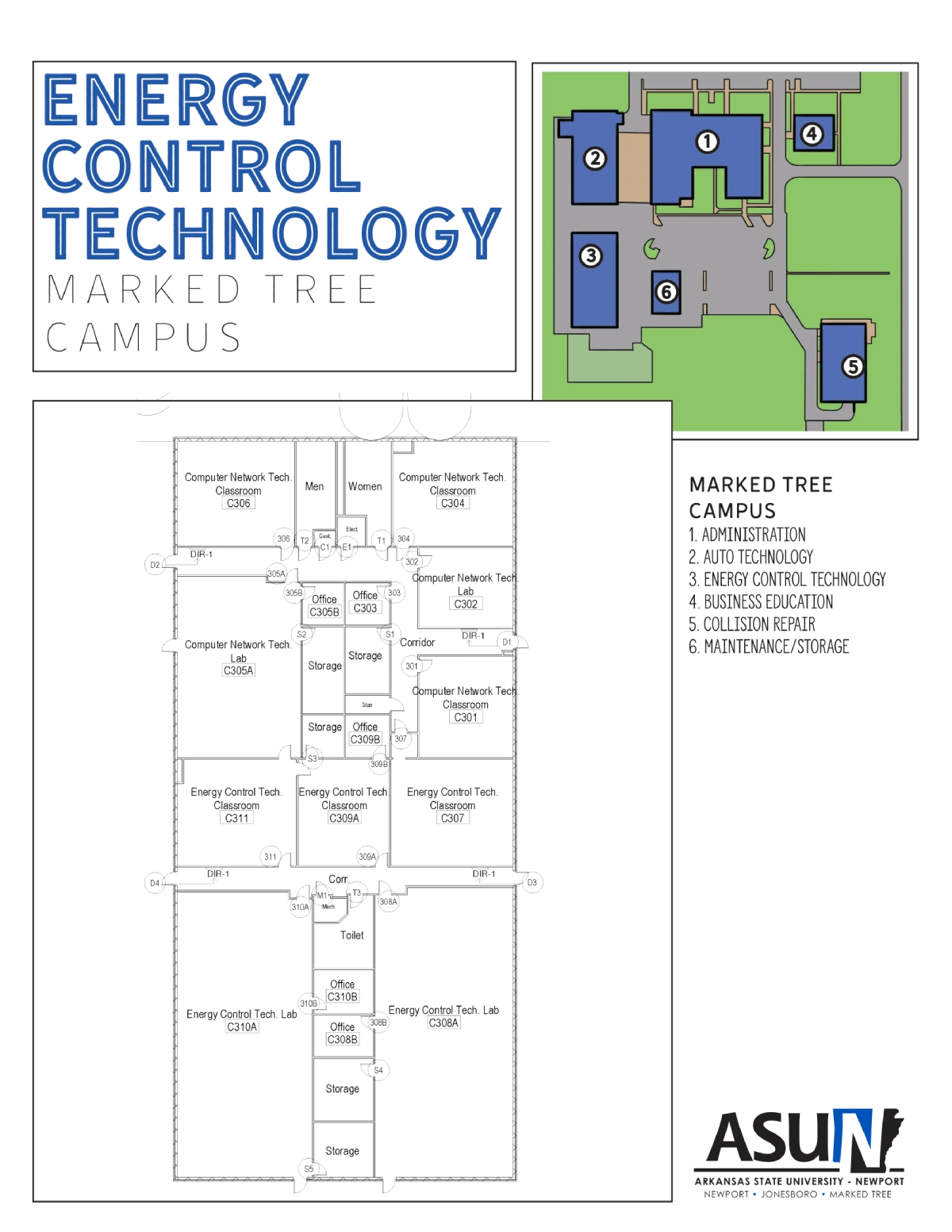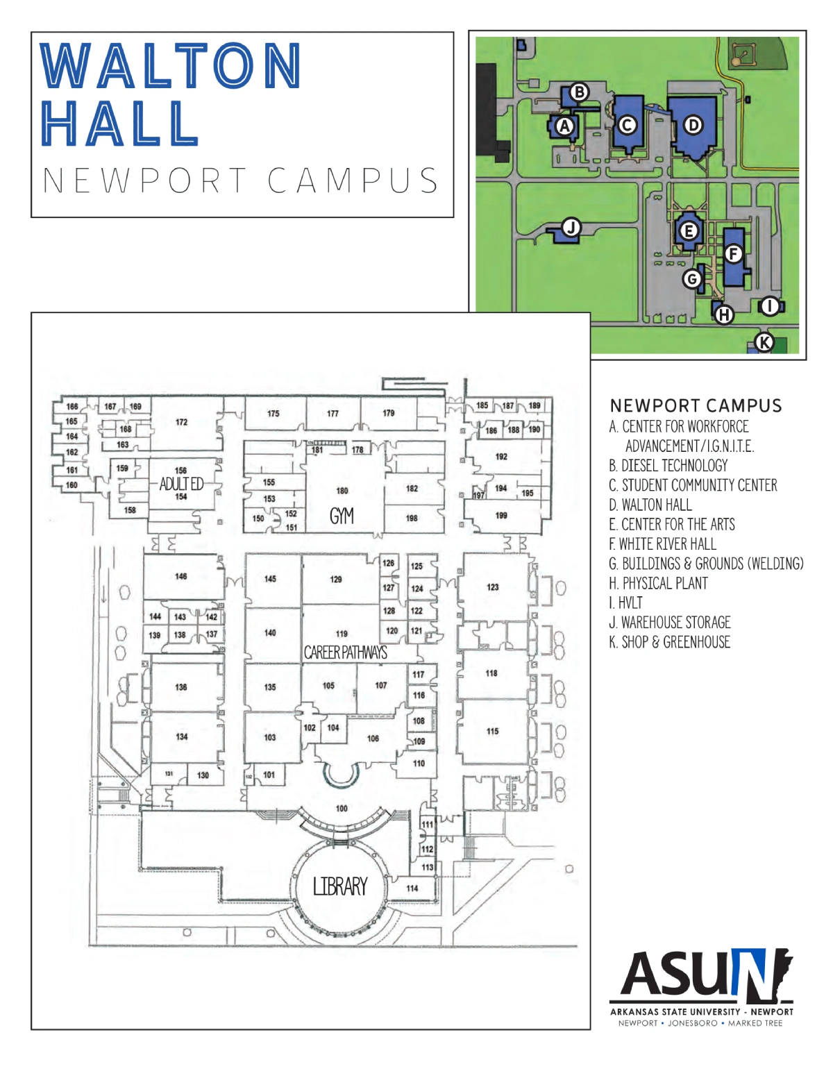 ASUN operates locations in addition to the main Newport campus. The maps below provide specific layouts for the Jonesboro and Marked Tree sites.