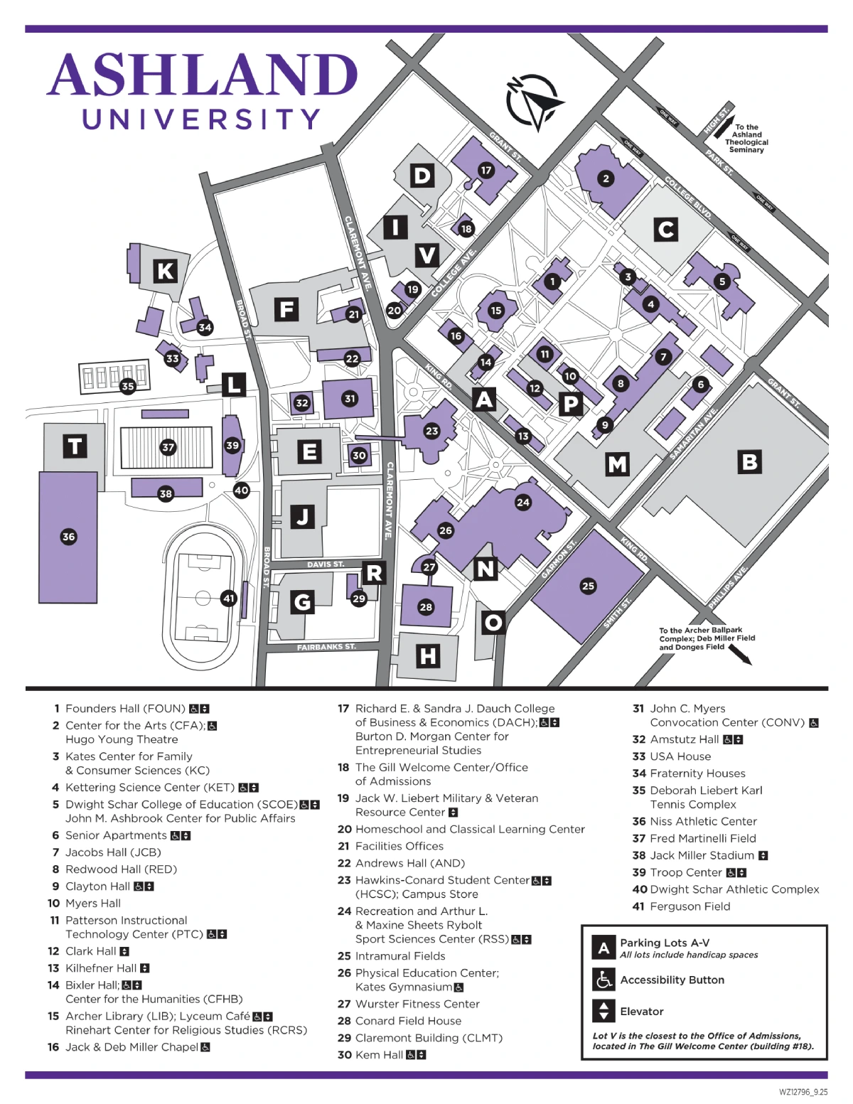 Navigate the 135-acre main campus in Ashland, Ohio. The Ashland University Campus Map provides a complete overview of all facilities, from the academic core along College Avenue to the athletic complexes.