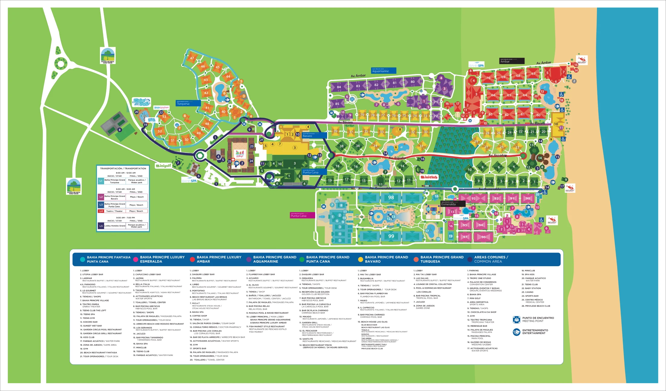 The map of Bahia Principe Fantasia Punta Cana, as of 2025, maintains its well-established structure. The core amenities—pools, dining areas, and children’s clubs—remain centrally located near the castles and the large lake-style pool. The beach access is still dependent on the shuttle system or a walk through the Esmeralda property. No significant changes have been made to the layout, and internal pathways remain crucial for navigating the resort. Bahia Principe Fantasia is located about 30 minutes from Punta Cana International Airport, ensuring easy access for guests.