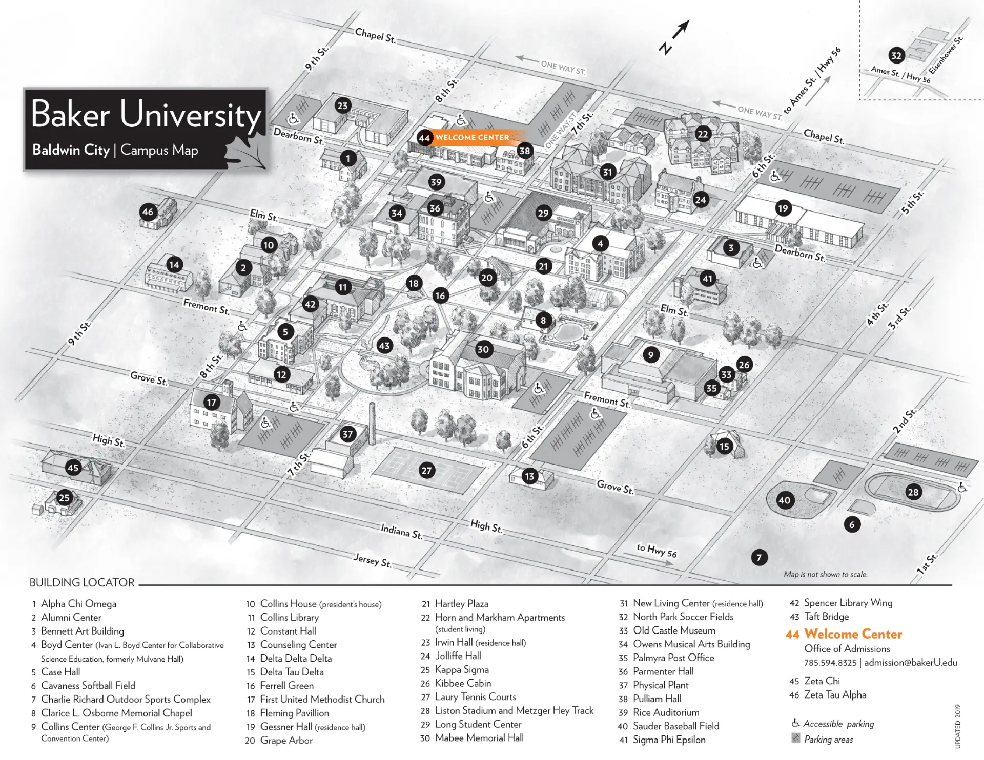 The Welcome Center is located along 8th St on the campus’s west side. The Baker University Campus Map provides a clear overview of the main academic and residential core.