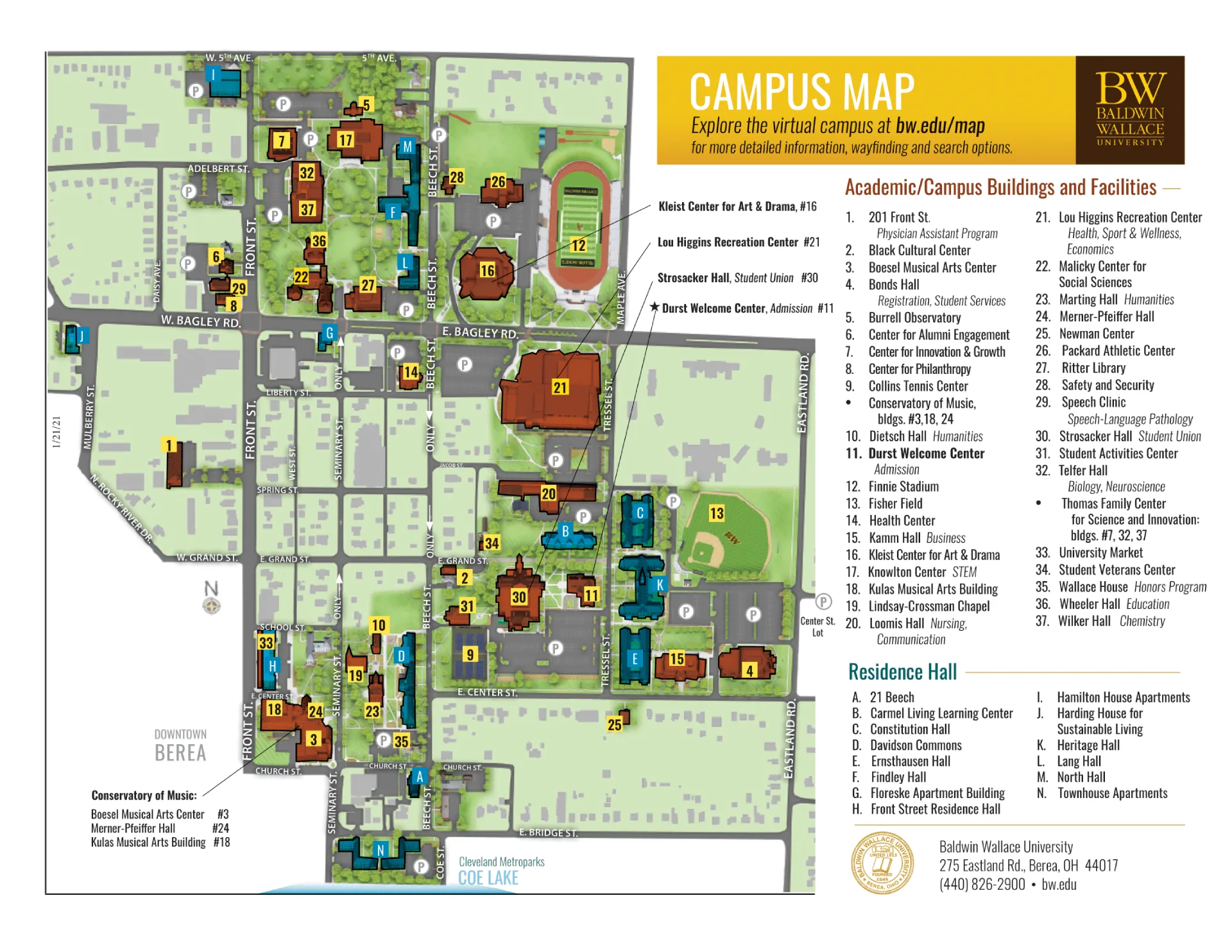 This map displays the primary academic , residential, and athletic areas of the Baldwin Wallace University campus. Use it to navigate between classes, find student services, and locate key facilities.