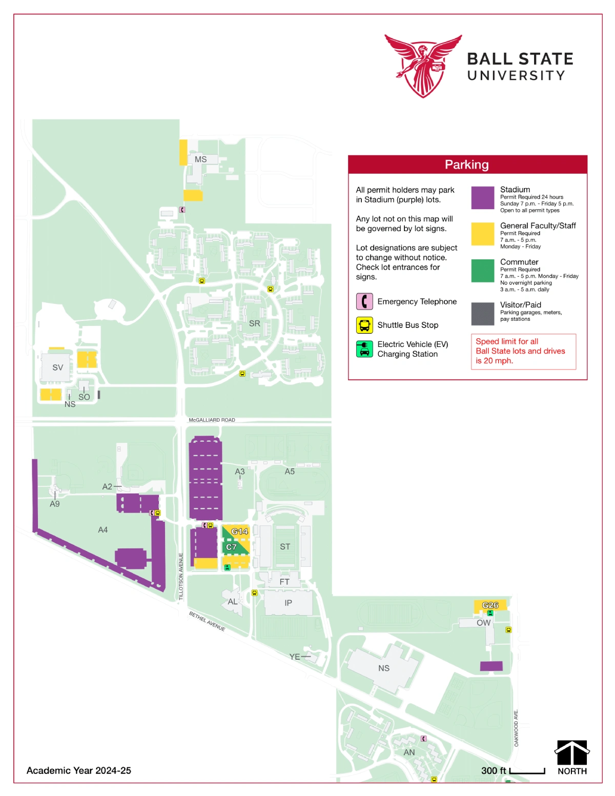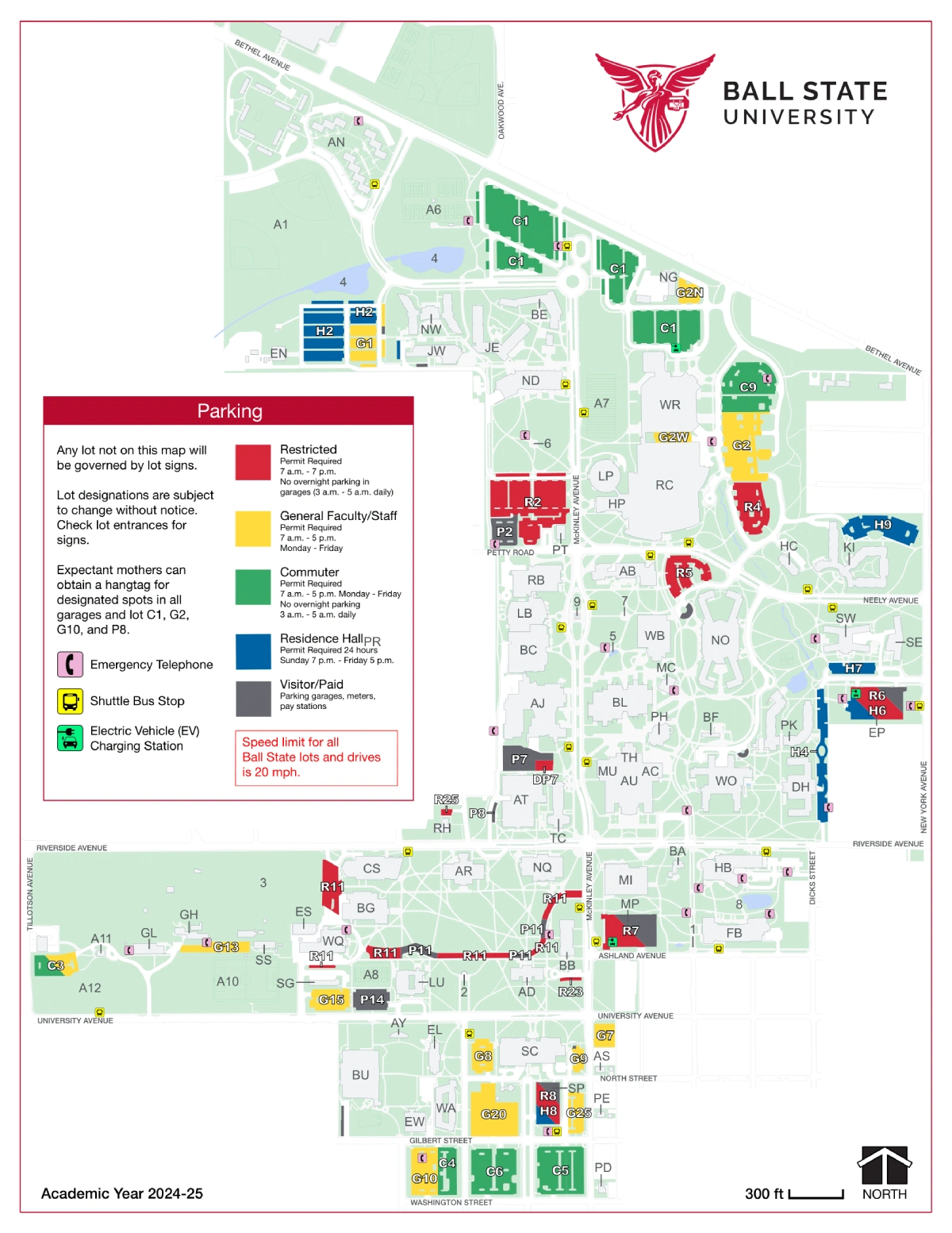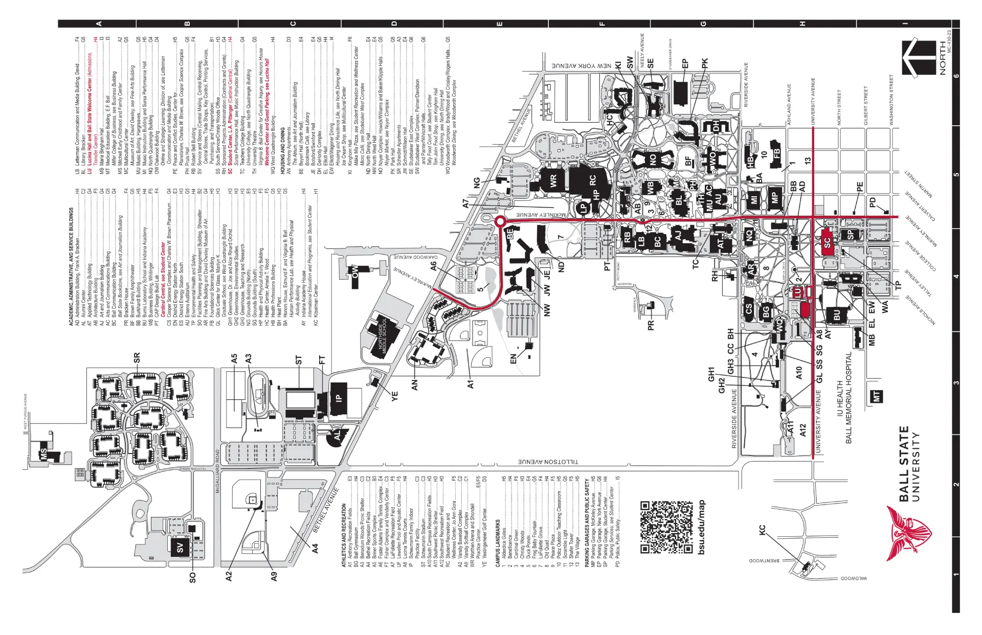 This map displays the primary layout of the Ball State University campus. It is designed to help students, faculty, and visitors locate academic halls, residential buildings, and athletic facilities.