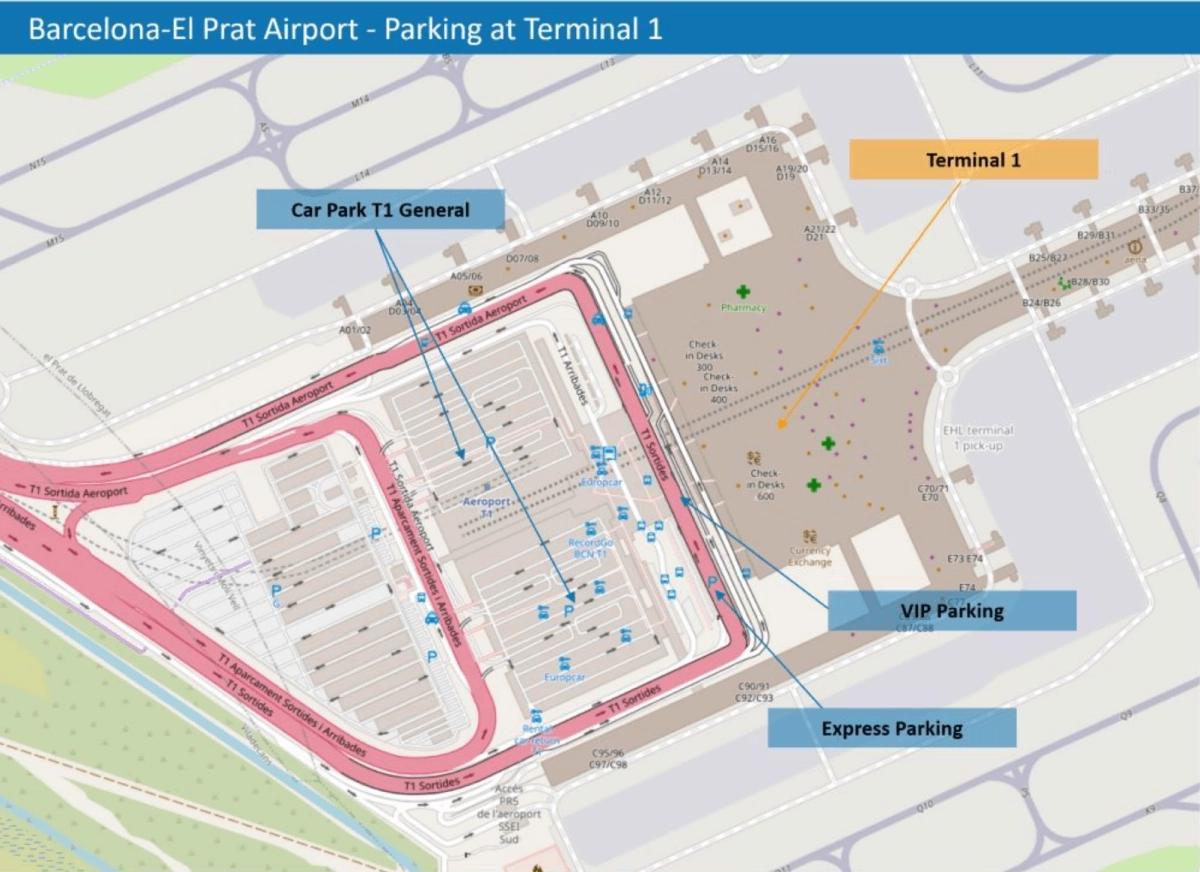 Parking spans both sides of the airfield. The Barcelona El Prat Airport Parking Map outlines how BCN organizes short-stay, long-stay, and bus parking across Terminals 1 and 2.