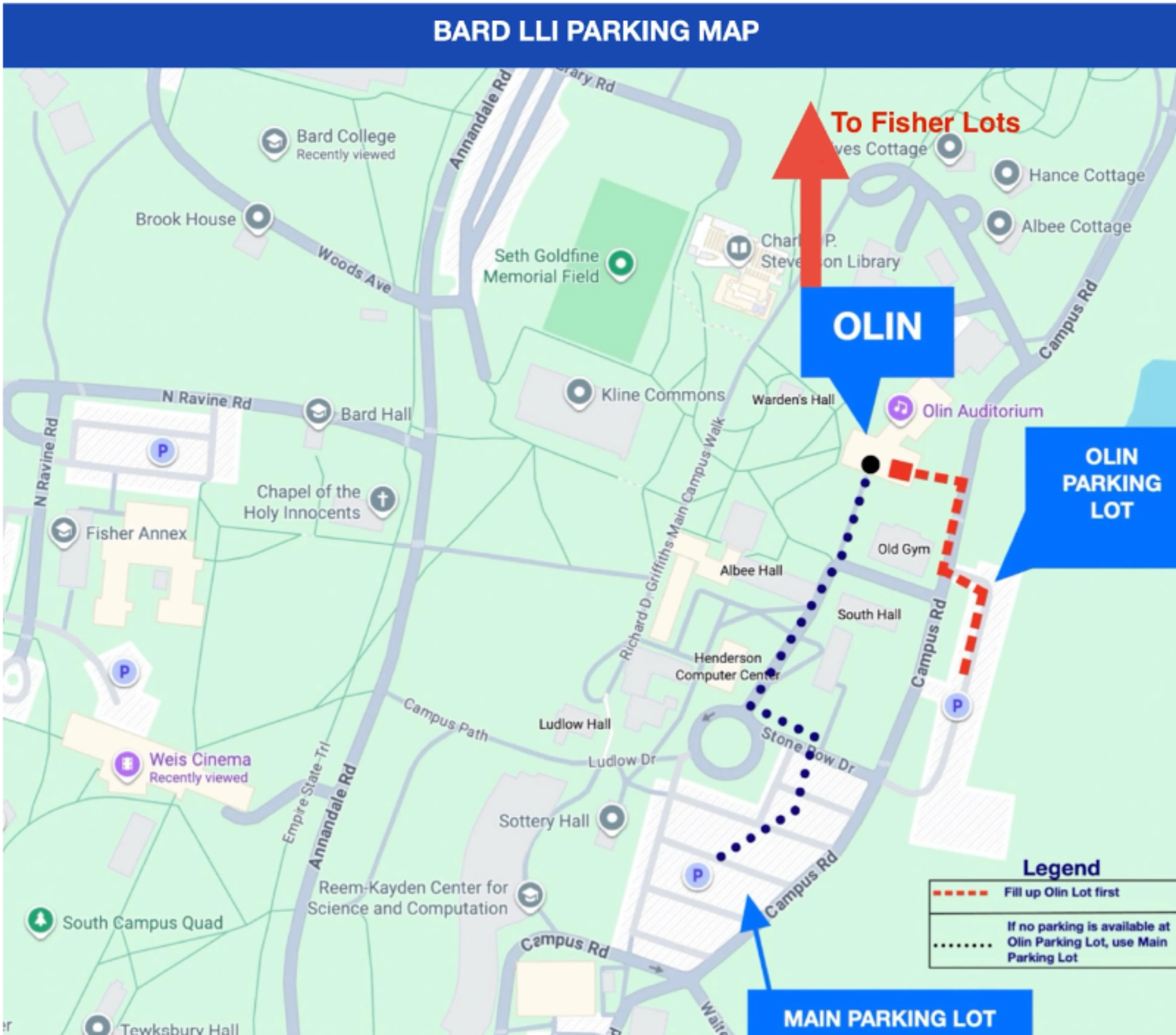 The College Main Entrance off Route 9G provides primary access. A separate Fisher Center Entrance is located just north of the main gate. Visitor parking is available near key destinations, including the Admission Office (Hopson Cottage) and the Stevenson Athletic Center. Refer to the parking map for specific lot designations.