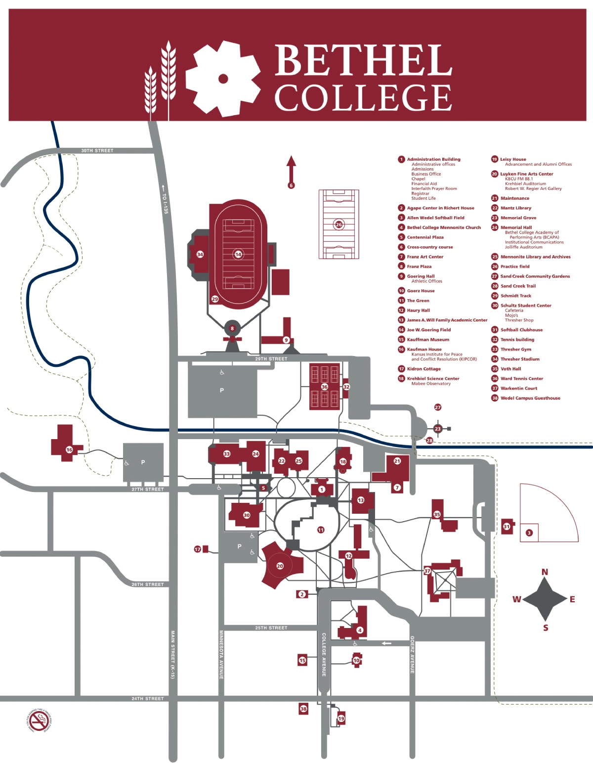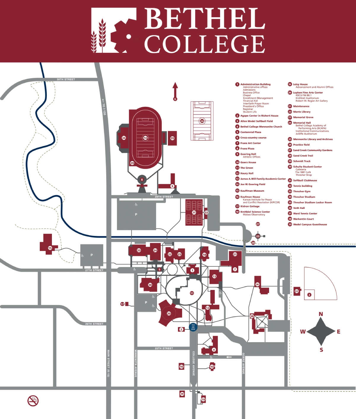 Navigate the Bethel College Newton Campus using the official Bethel College Newton Campus Map. The main academic core is situated between 27th Street and 29th Street, with key landmarks like the Administration Building and Luyken Fine Arts Center located east of College Avenue.