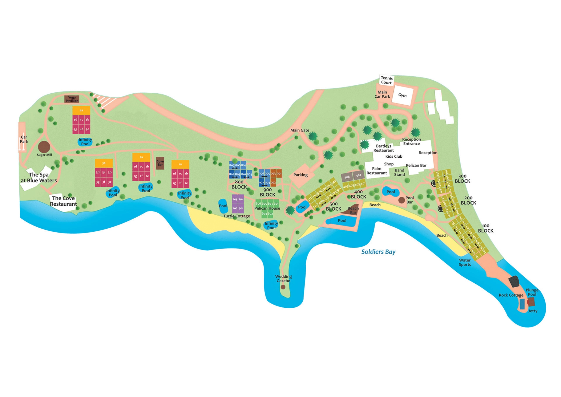 The resort core sits mid property, where reception, the Sugar Mill, Pelican Bar and the main social terraces cluster as the navigation pivot. From this hub, the northern side holds Block 100 on the beachfront with Deluxe Beachfront Rooms, backed by the stepped hillside 200 and 300 Blocks. The southern side extends into the flatter 400 and 500 family Blocks around Veronica’s Pool, the Kids Club and the Palm Restaurant, then climbs toward The Cove Suites and Cove Restaurant on the limestone bluff.