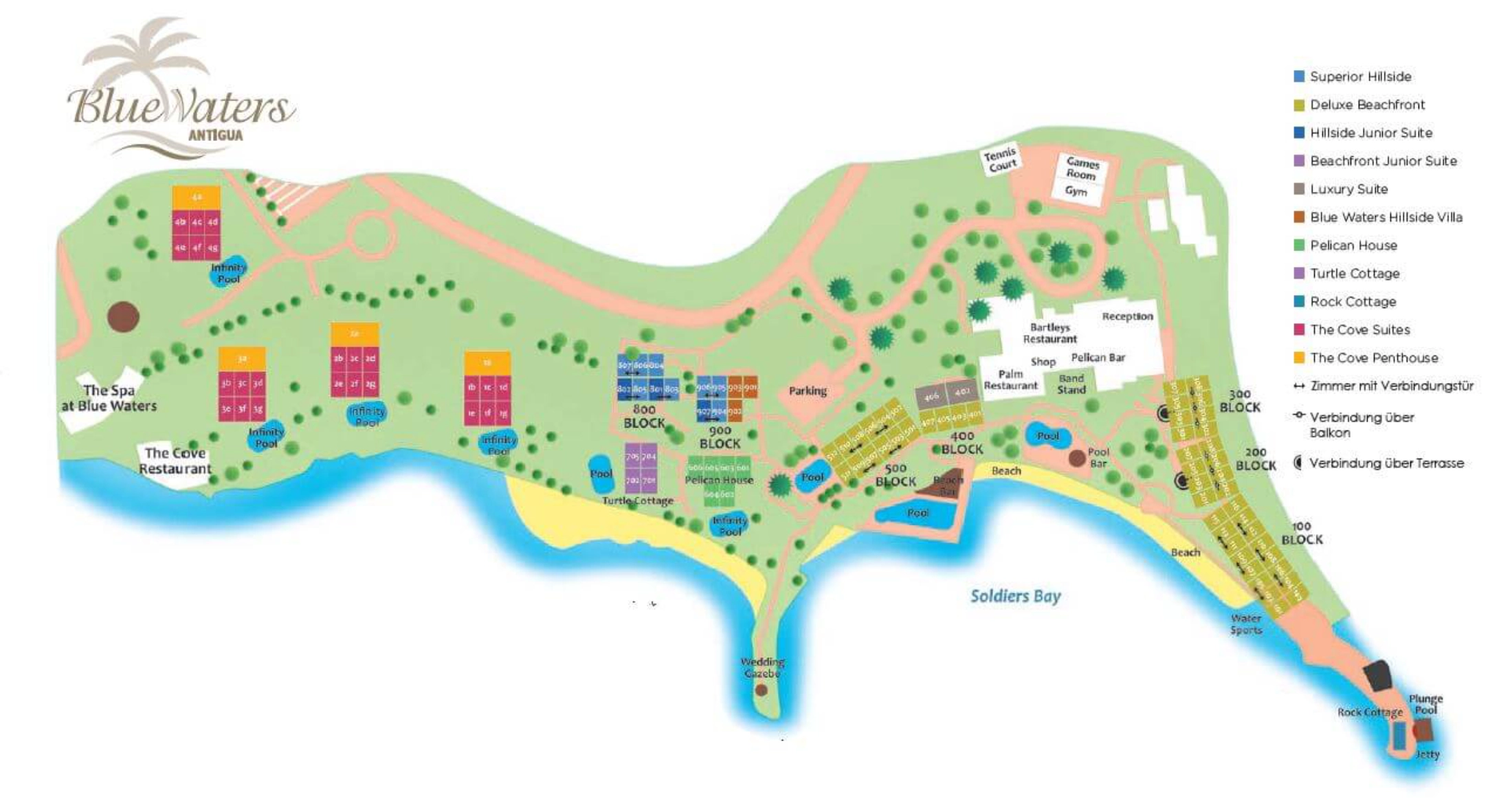How is Blue Waters Resort Antigua laid out in terms of main zones, buildings, paths, and beachfront?