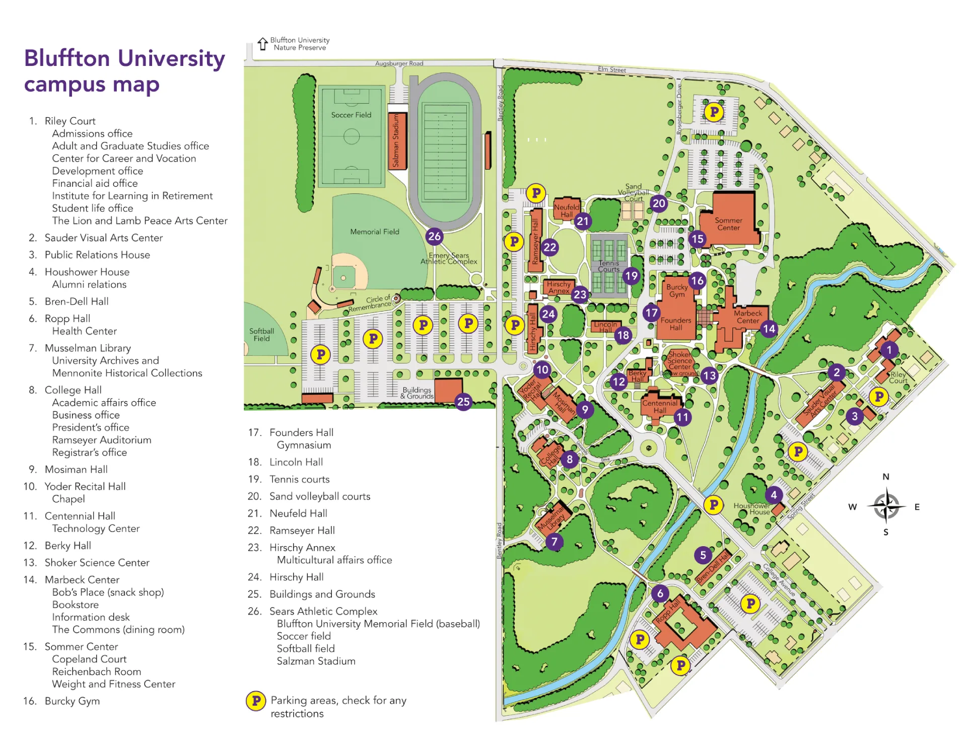 The Bluffton University Campus Map provides a guide to campus, stretching from the Emery Sears Athletic Complex along Augsburger Road to the academic core between College Hall and Marbeck Center.