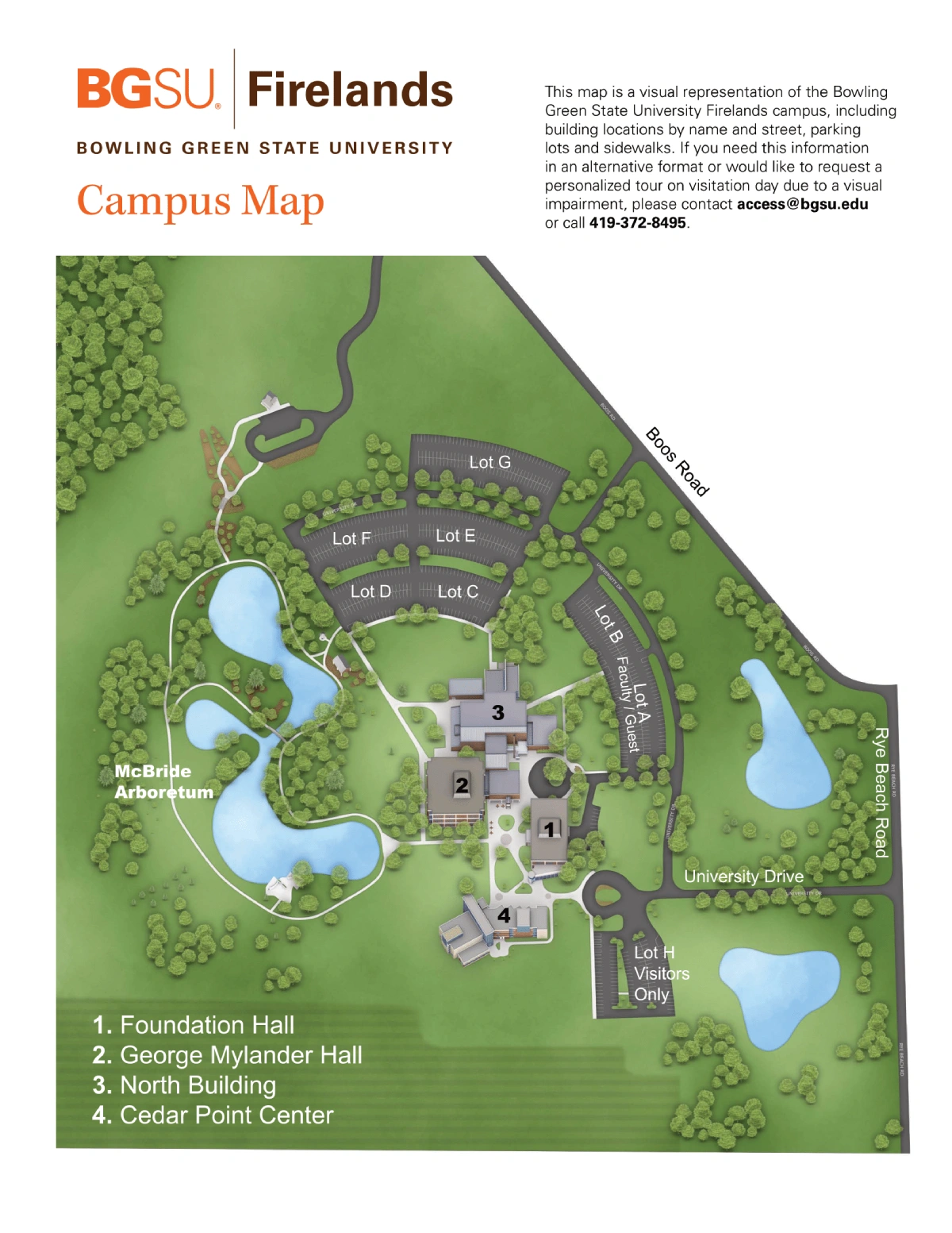 Welcome to the Bowling Green State University Firelands Campus Map. This guide helps you navigate the campus, from the central academic buildings like Foundation Hall and the North Building to the scenic McBride Arboretum on the west side of campus.
