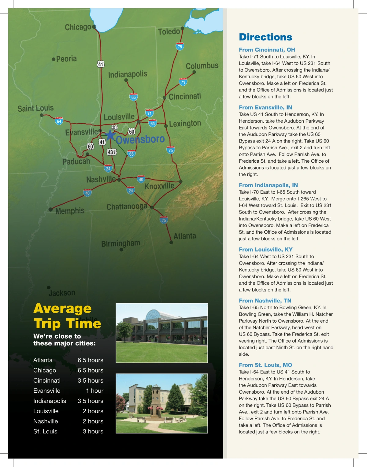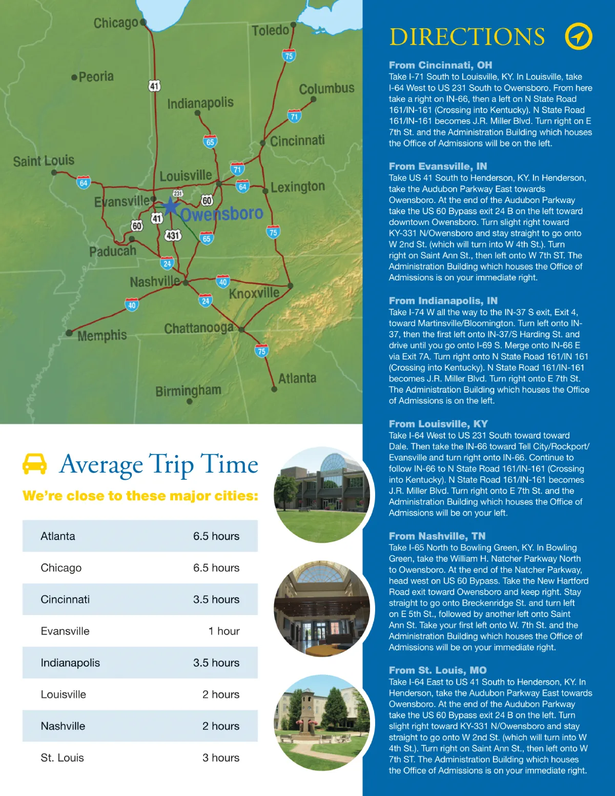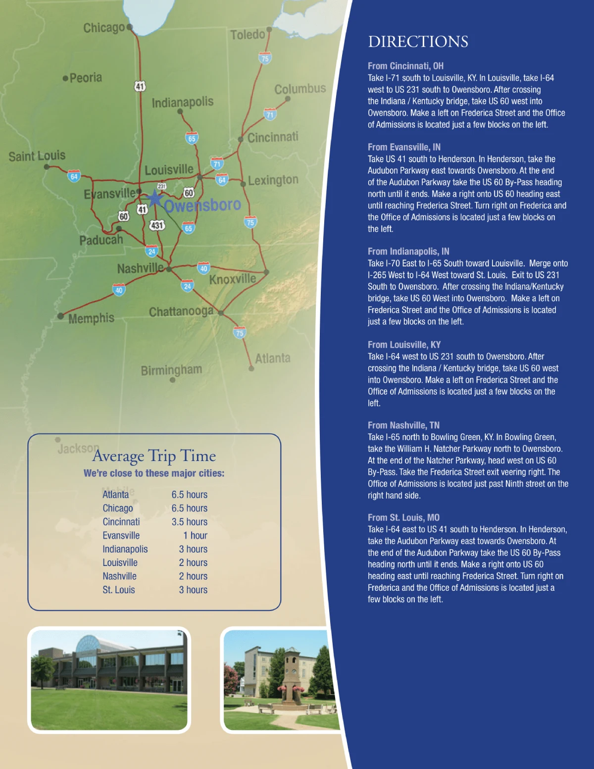 Brescia University is located in Owensboro, KY. It is accessible from major cities like Nashville , Louisville , and St. Louis. Driving directions guide visitors to the campus, with main access roads including Frederica Street and 7th Street.
