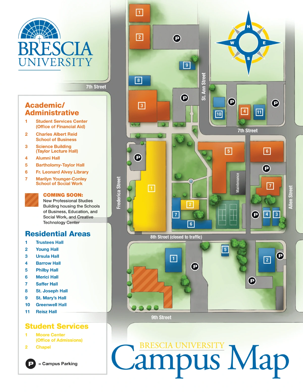 This map displays all buildings and facilities at Brescia University. It is designed to help students, faculty, and visitors locate academic halls, residential areas, and student service centers like the Moore Center.