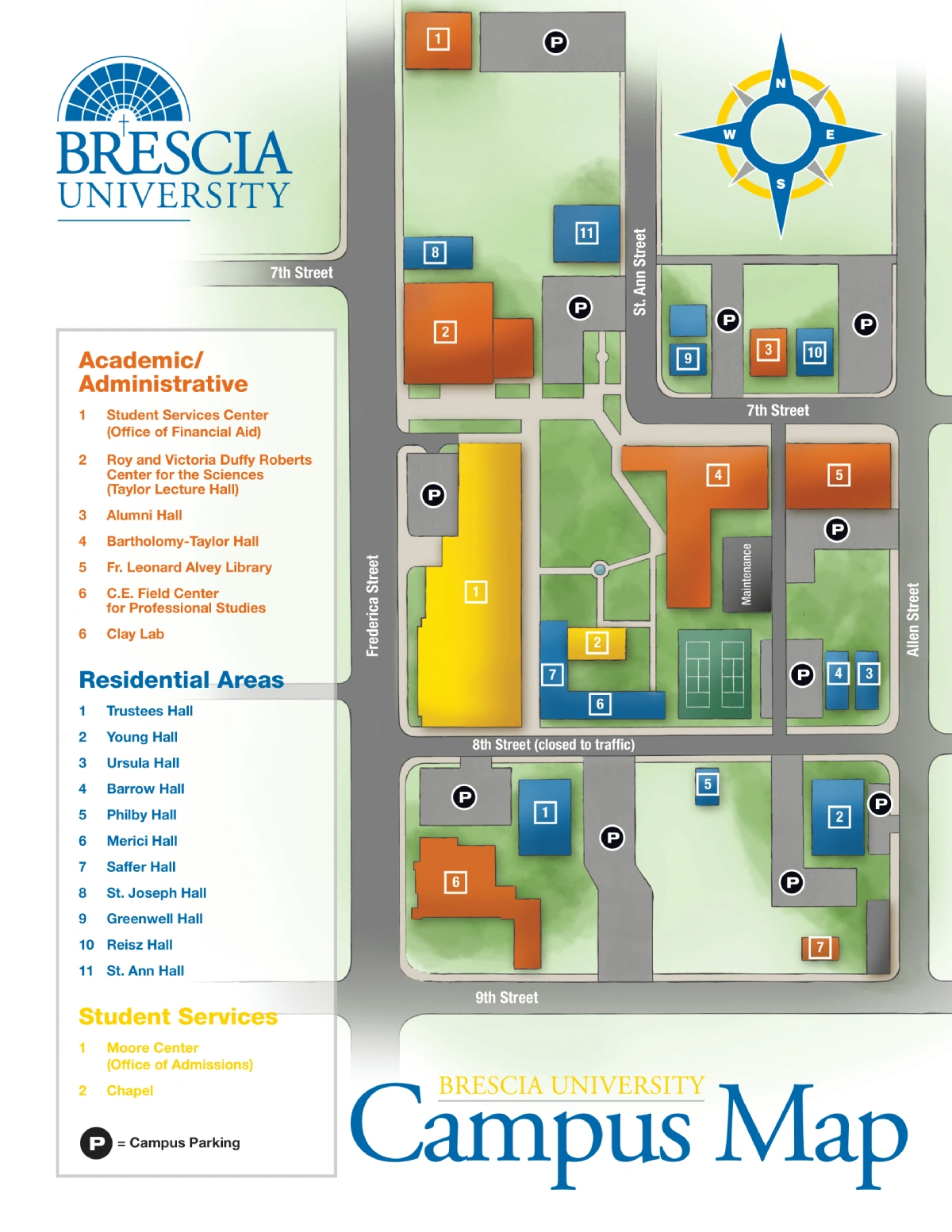 Welcome to the official Brescia University Campus Map. This guide helps you navigate the campus, which is organized between Frederica Street and 9th Street. Key academic buildings like the Roy and Victoria Duffy Roberts Center for the Sciences are located near the C.E. Field Center for Professional Studies.