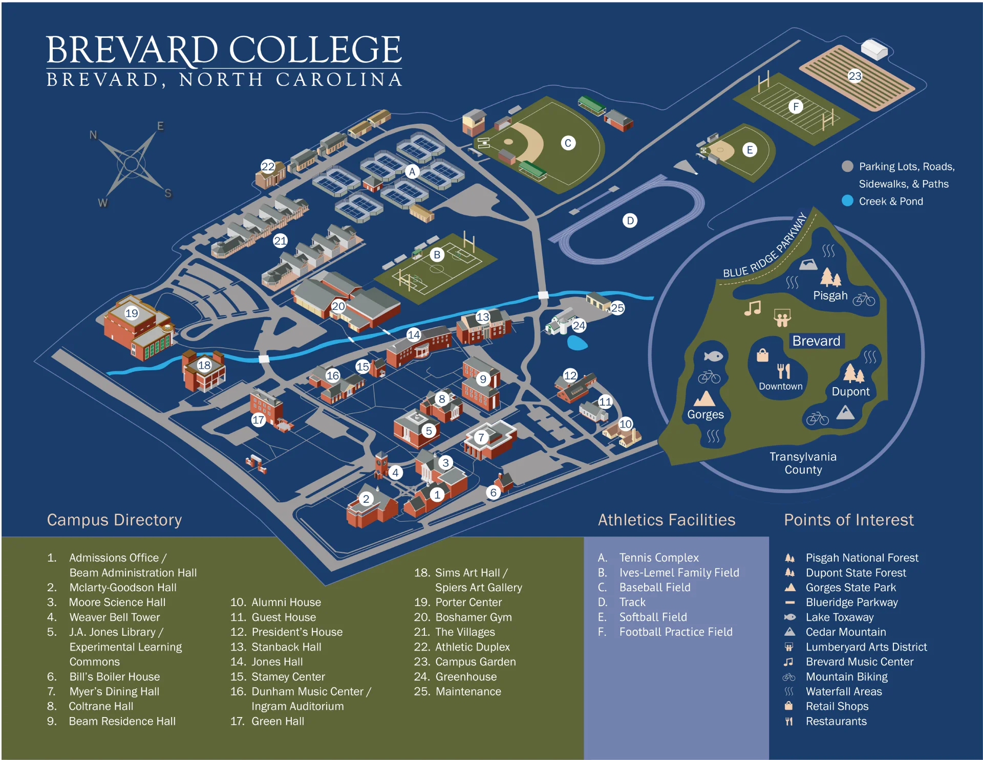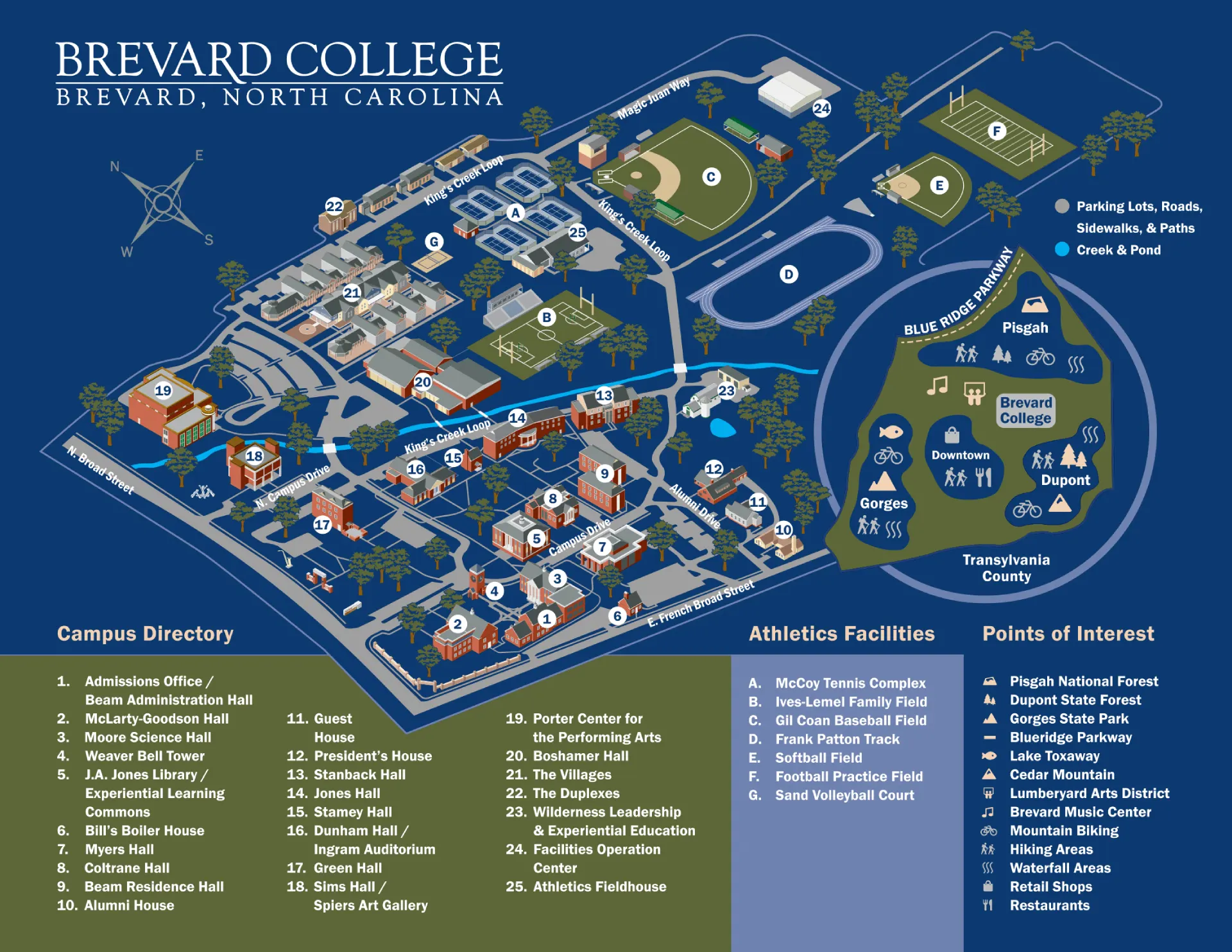 This map details the primary campus layout. It provides locations for academic halls, residence halls, athletic facilities , and key points of interest to help students and visitors navigate Brevard College.