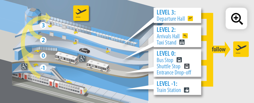 Use this Brussels Airport Ground Transportation Map to find every way into and out of the terminal precinct—by rail, road, or cycle path.