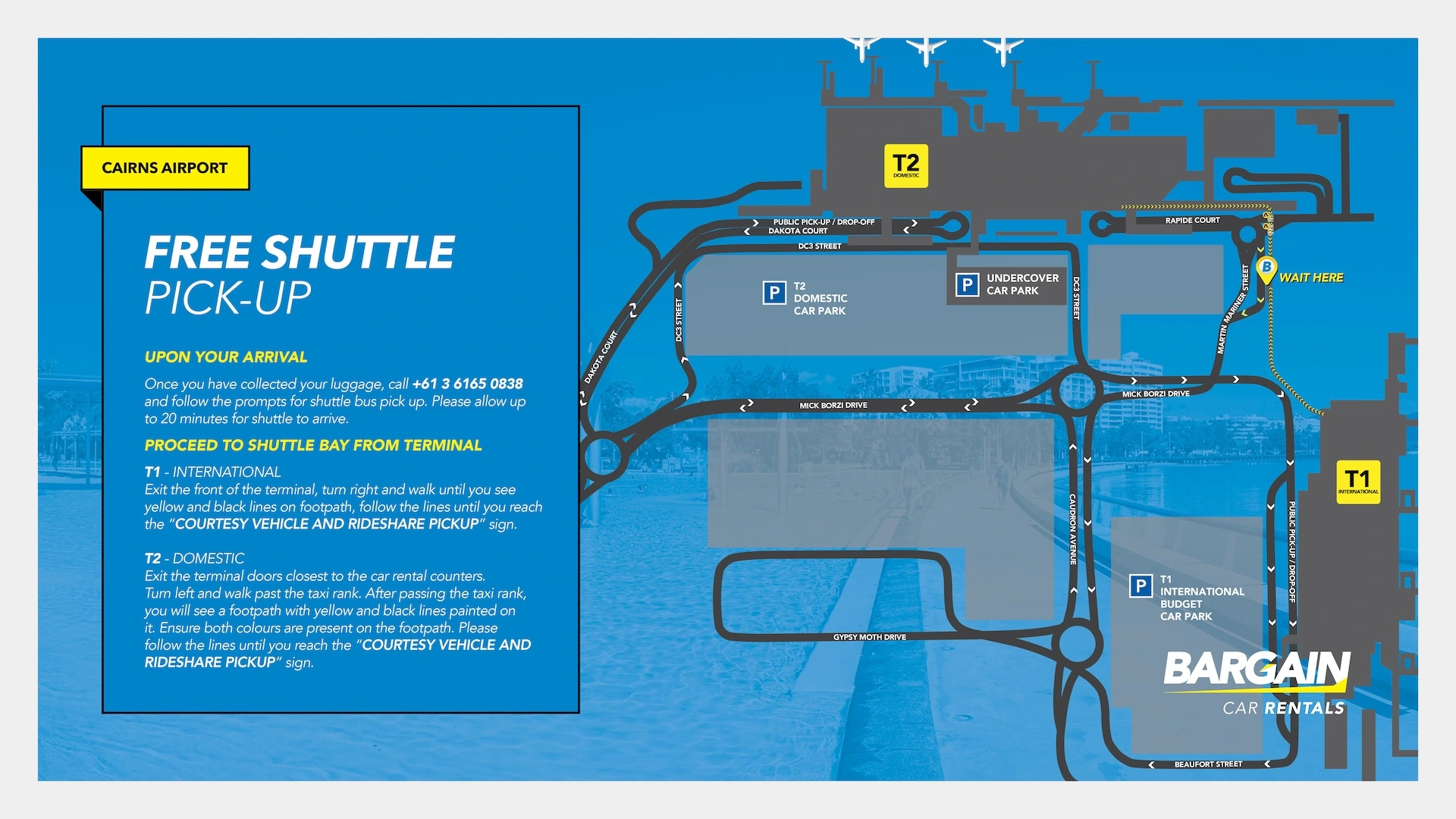 With this Cairns International Airport Ground Transportation Map, you can spot every key link between the terminals and onward travel to Cairns city and beyond.