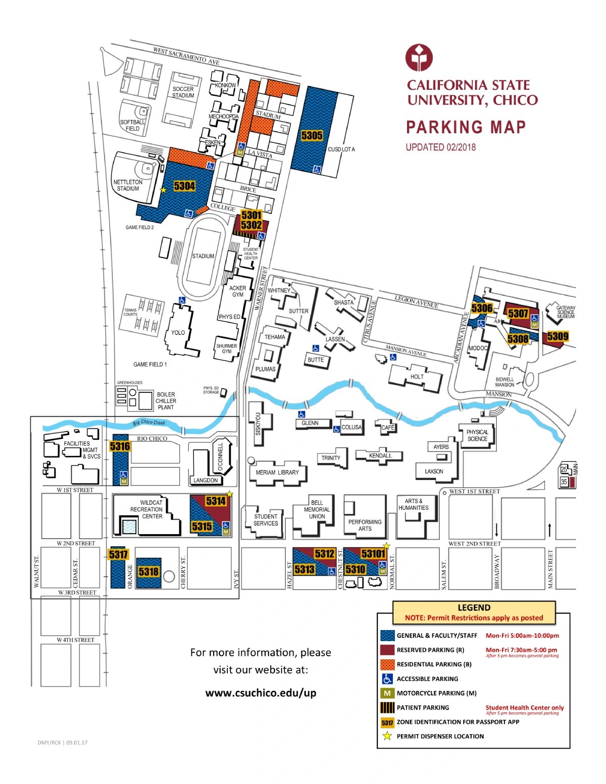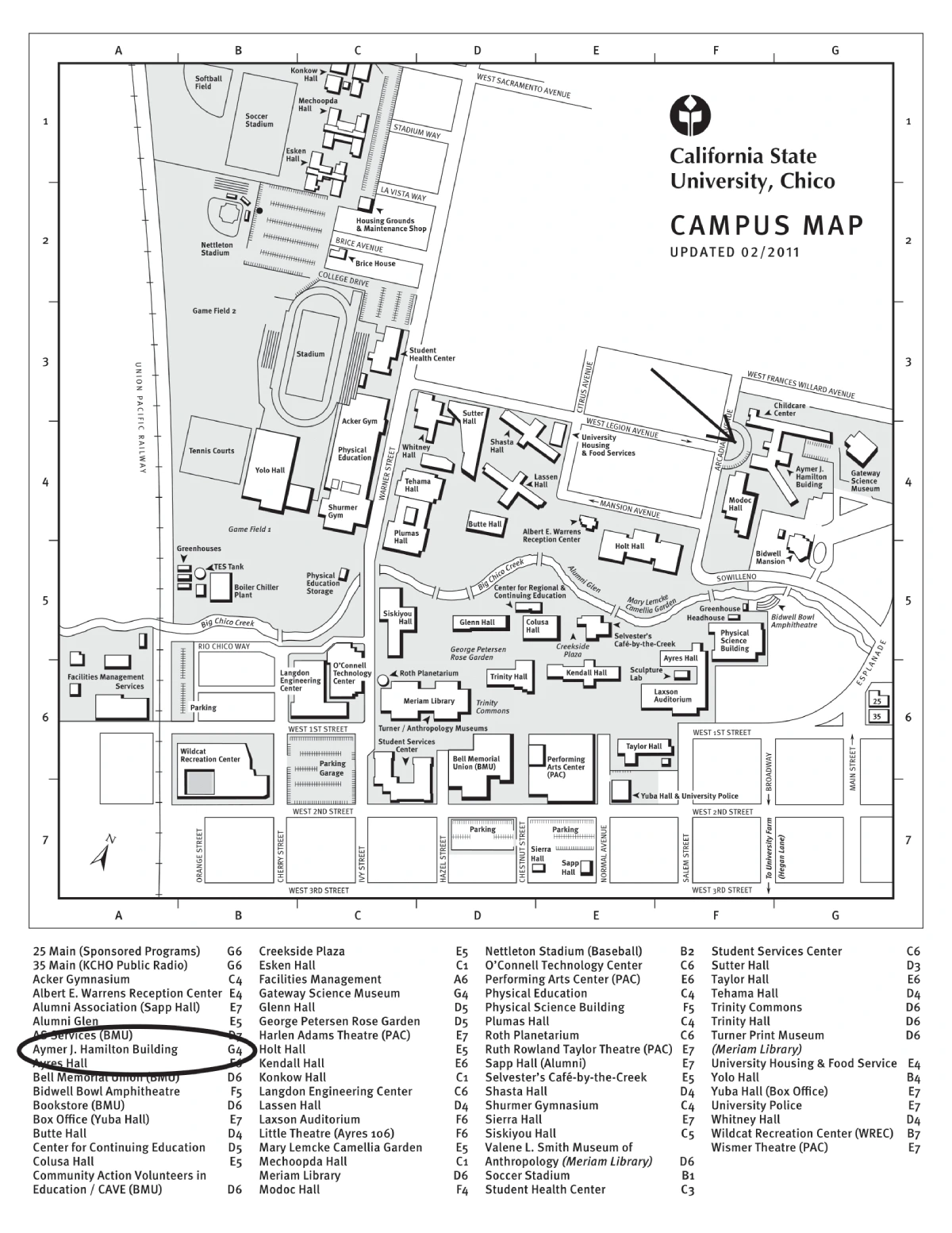 This map shows the primary layout of the Chico State campus. It helps users navigate between academic buildings, residential halls, and athletic facilities.