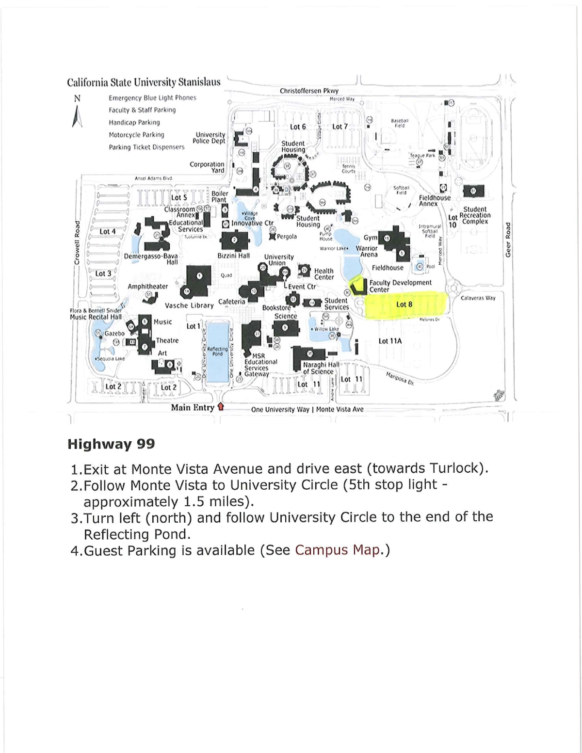 The campus is bordered by major roads including Geer Road and Christoffersen Parkway. Internal loop roads like University Circle provide access to central buildings. Public transit stops are located near the main entrances, linking the campus to the surrounding Turlock area.