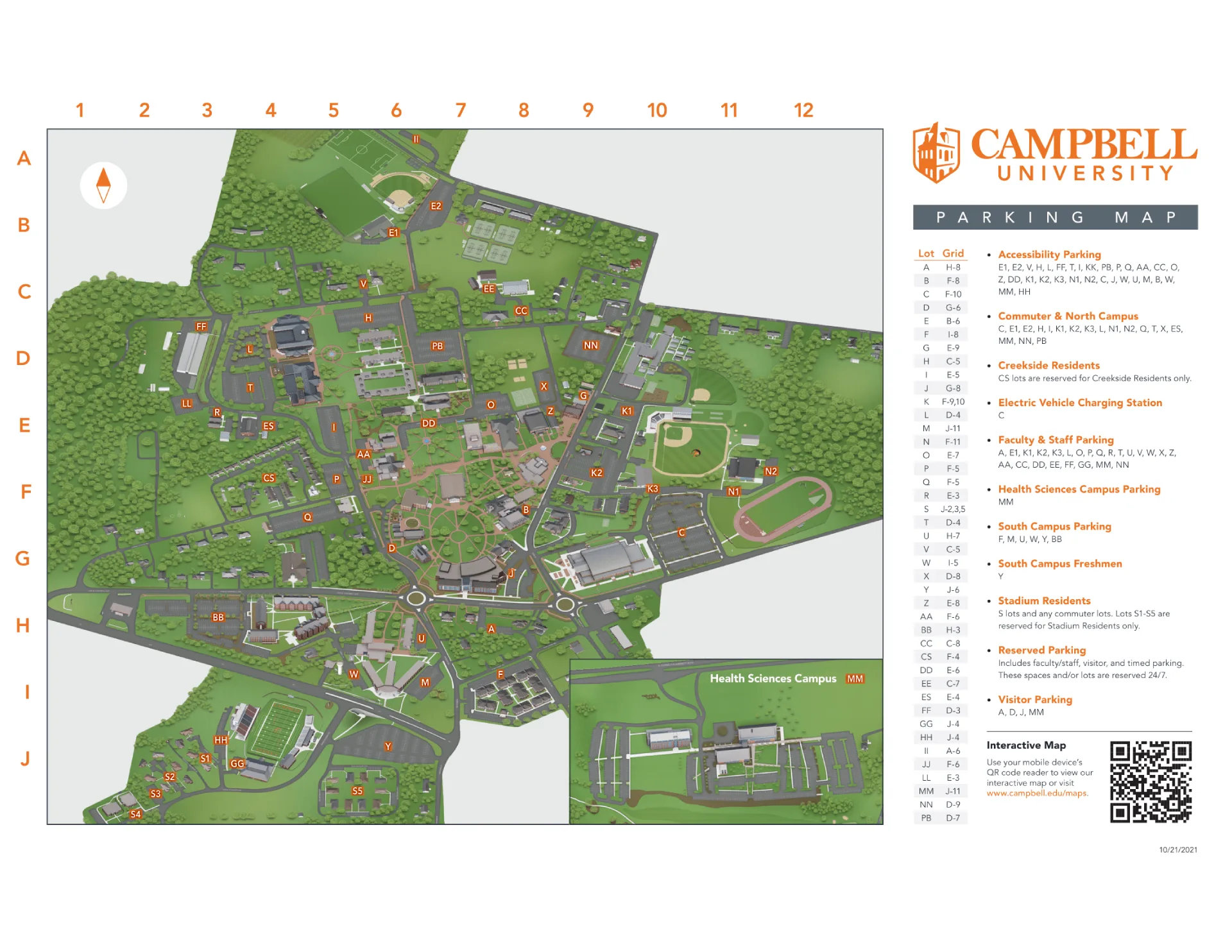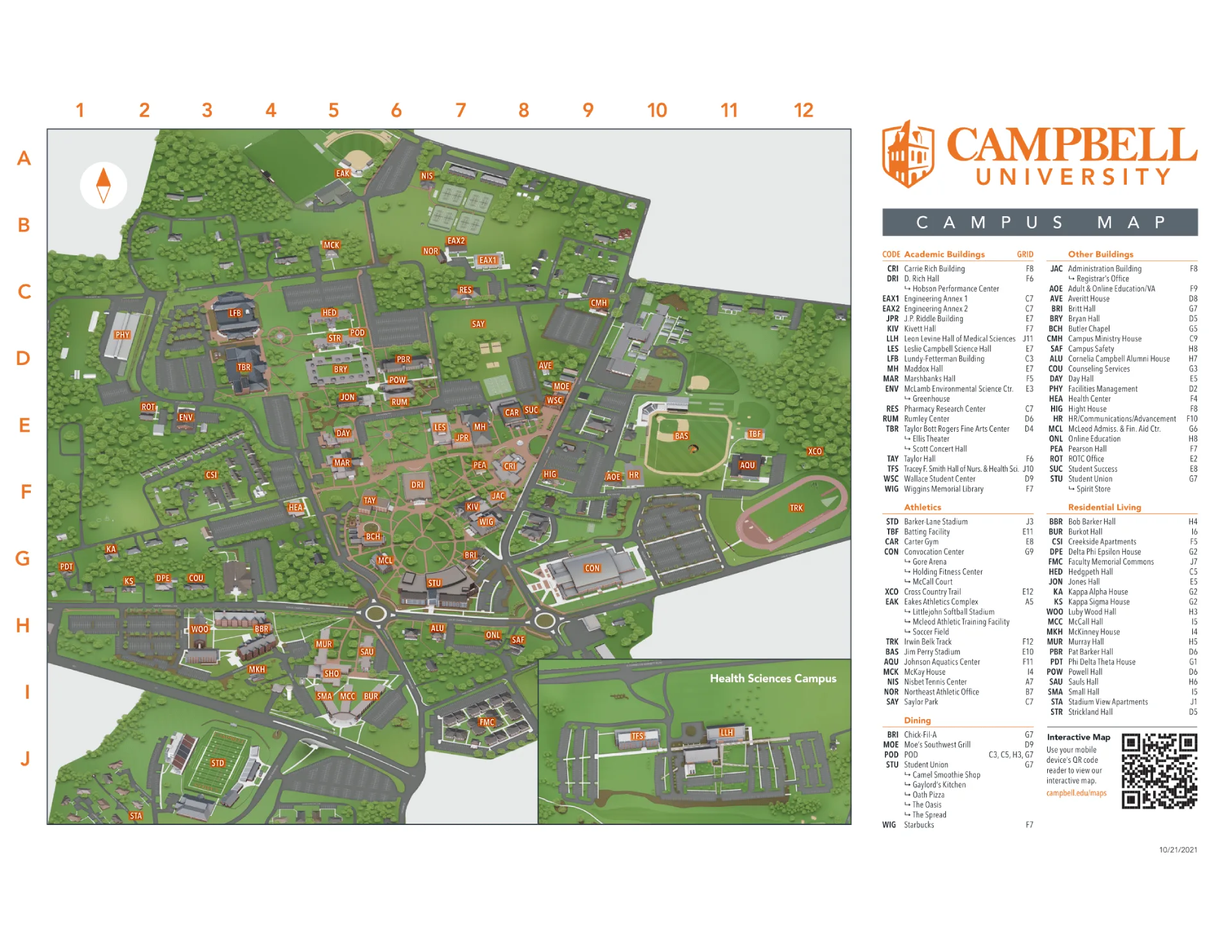 Welcome to the Campbell University Campus Map. This guide helps you navigate the campus, from the Lundy-Fetterman Building on the west side to the Convocation Center in the east.