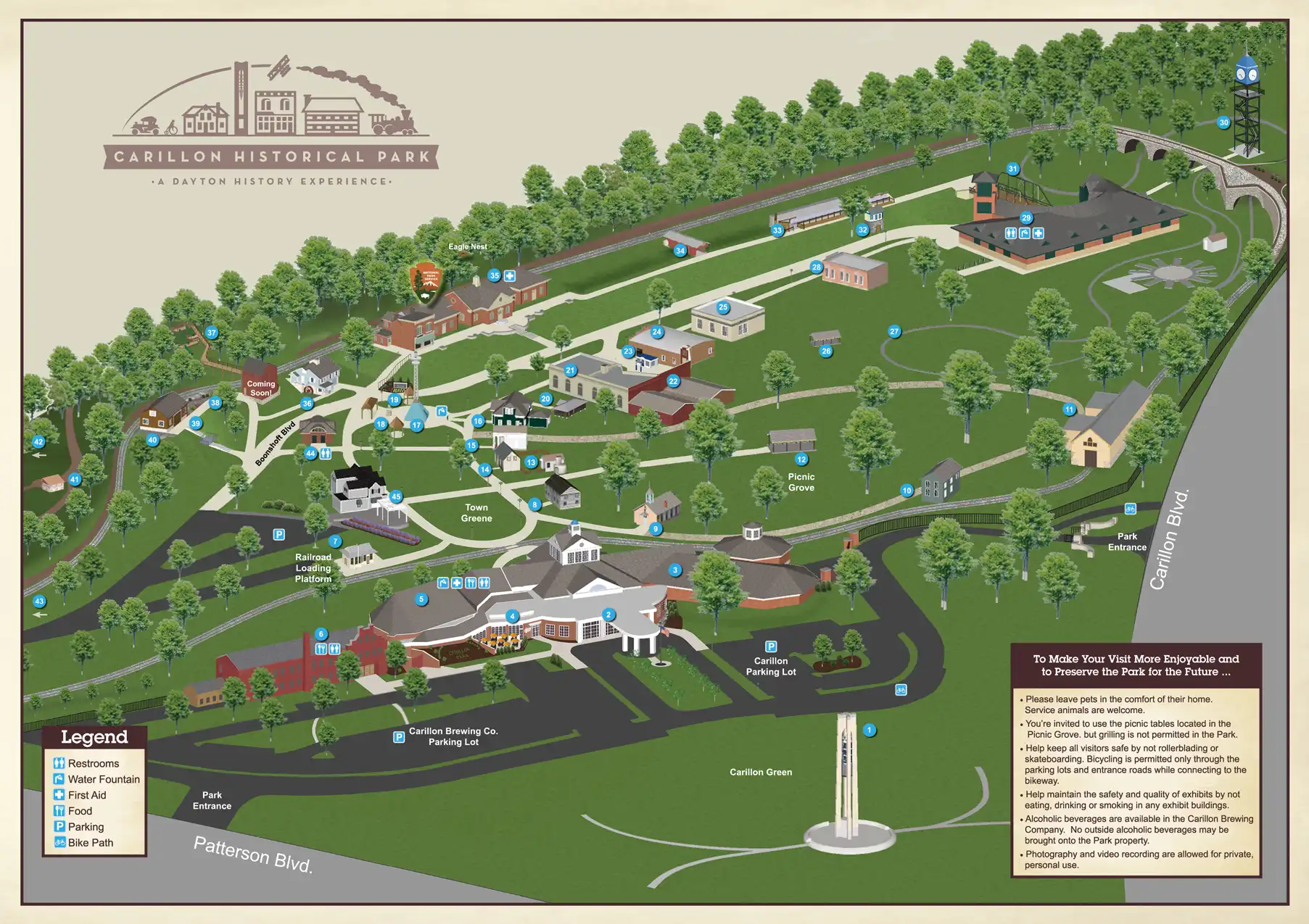 The Carillon Historical Park Museum map (2024) guides visitors through a 65-acre open-air campus in Dayton, Ohio, organized into themed sections that highlight the city’s rich history of innovation, transportation, and industry.