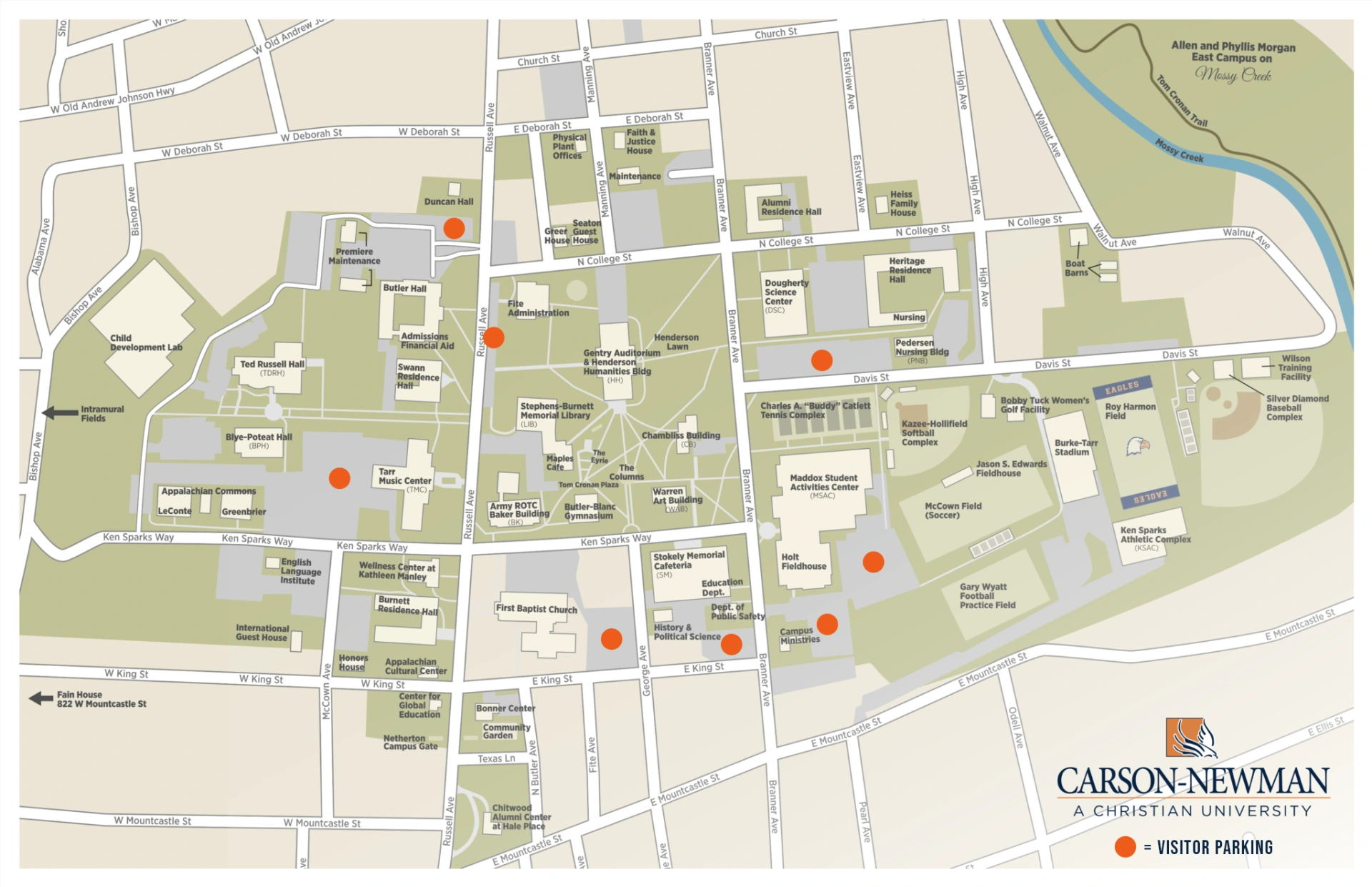 Parking lots are distributed throughout campus, located near residence halls and major academic buildings. Visitors should refer to the specific Carson-Newman University Parking Map 2025 for designated visitor parking areas and permit requirements.