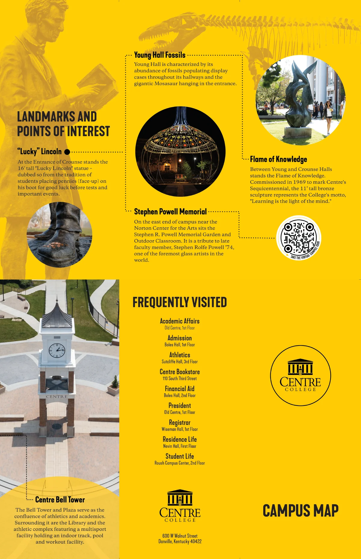 The campus is anchored by West Walnut Street, which runs centrally through the grounds. To the west, the Norton Center for the Arts stands as a major cultural hub, while Old Centre occupies a central position near the Admission Welcome Center. The layout integrates open spaces like the Centre Garden near the dining facilities and the Powell Memorial.