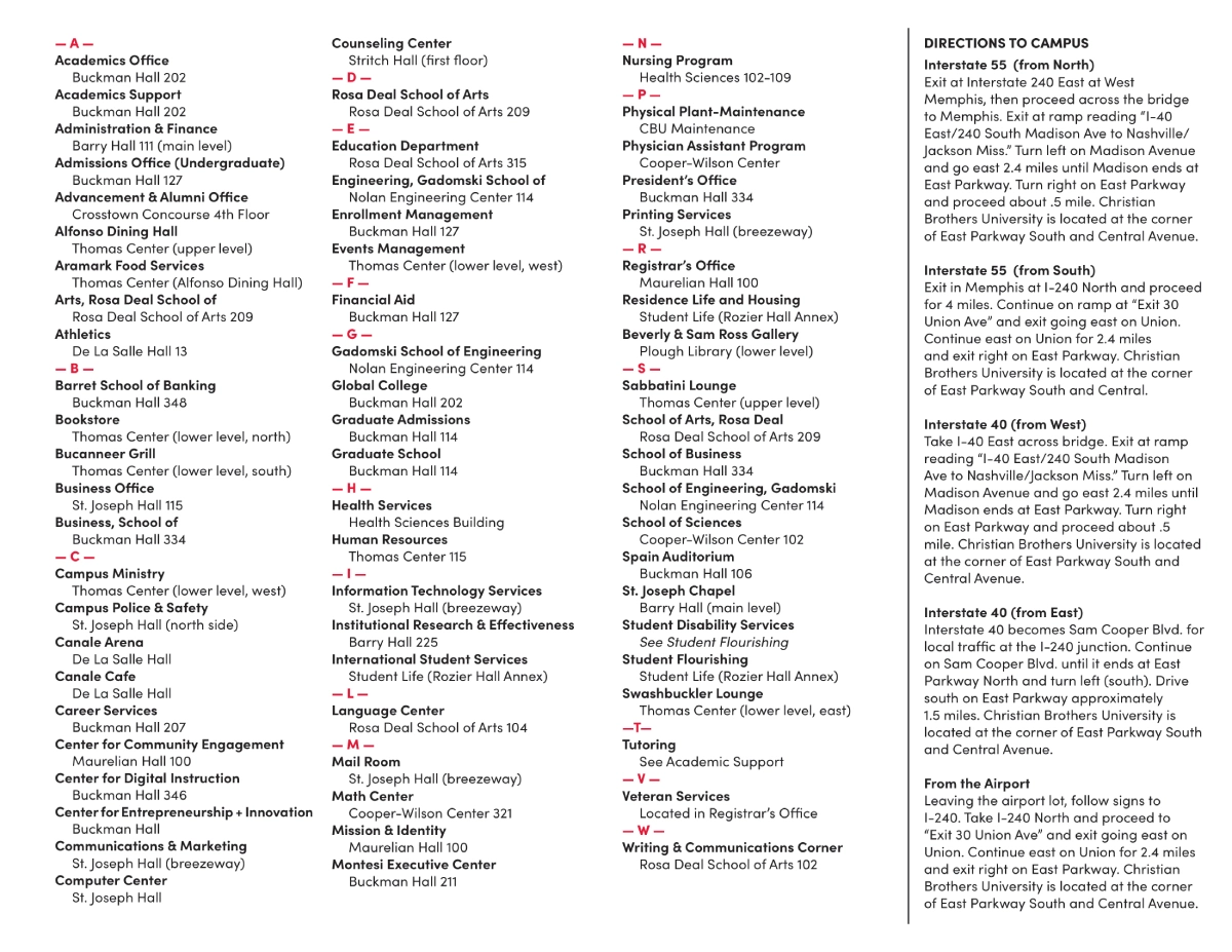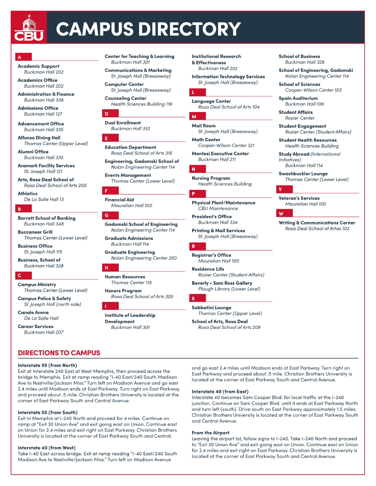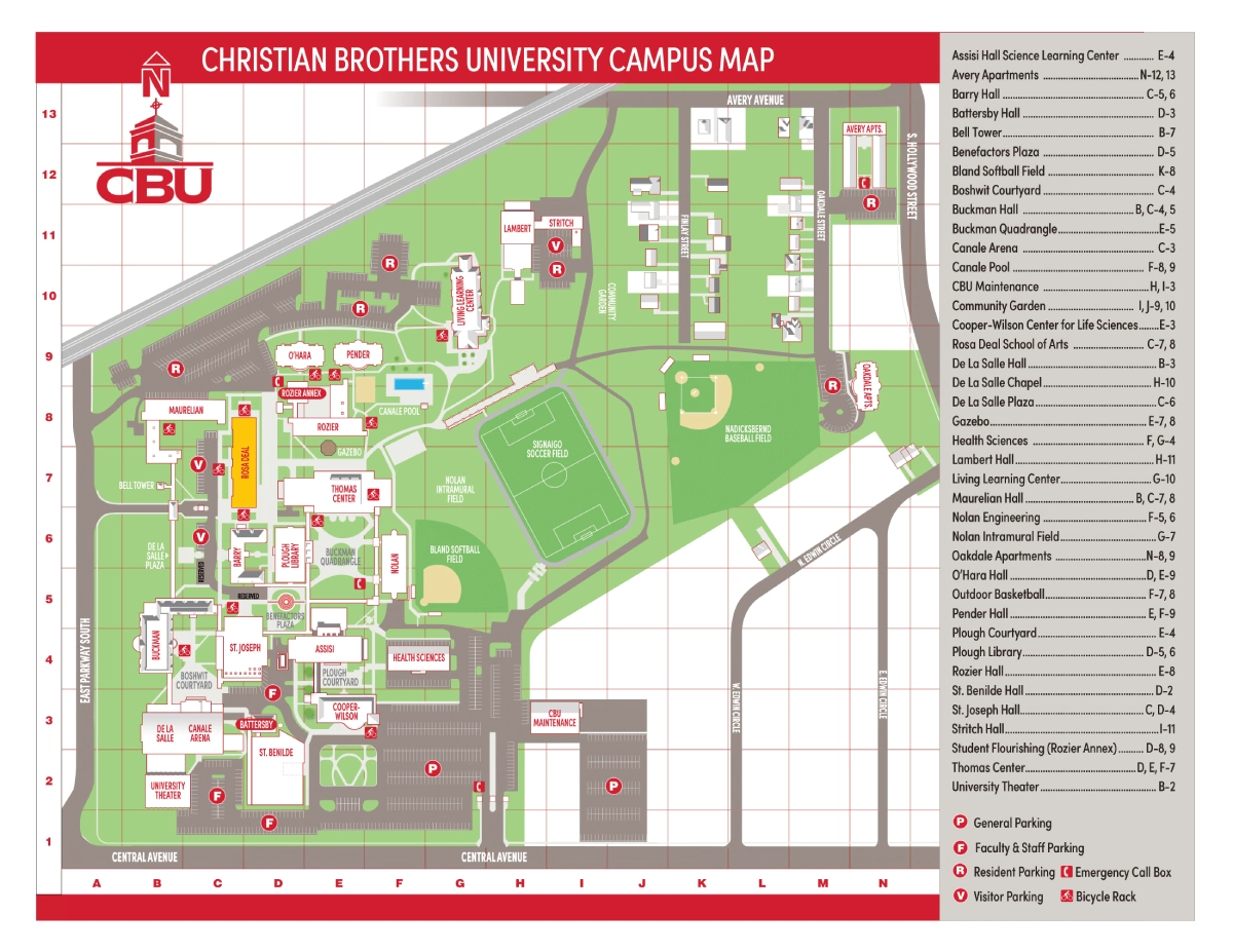This Christian Brothers University Campus Map outlines the layout of the university’s grounds in Memphis. Bounded by East Parkway South to the west and Central Avenue to the south, the campus centers around the Buckman Quadrangle.