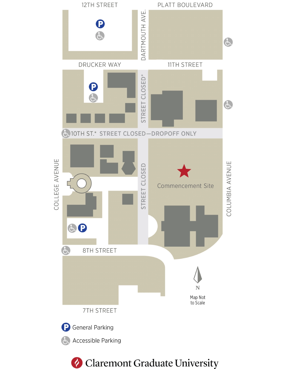 The Claremont Graduate University Campus Map covers the academic area situated south of Foothill Boulevard and north of 8th Street. It highlights major academic hubs like the Ron W. Burkle Family Building and the Honnold/Mudd Library located along Dartmouth Avenue.