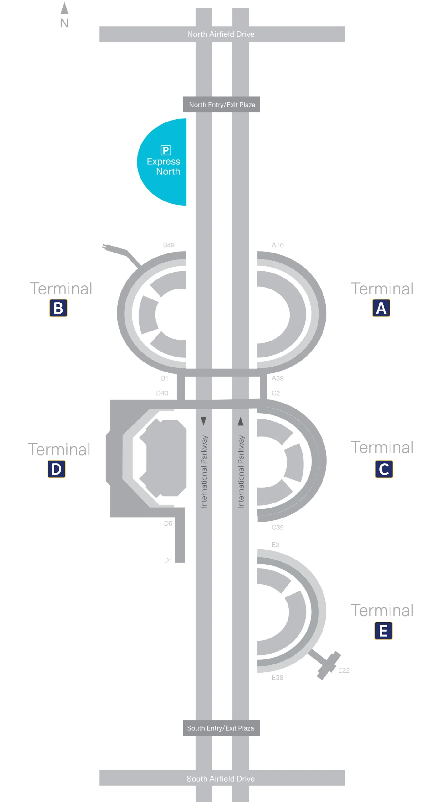 Follow the blue “Parking” and “Terminal” signs as you approach Dallas Fort Worth International Airport (DFW); each of the five terminals (A–E) has its own garage steps from Departures. That’s because DFW’s parking network includes Terminal, Express, Remote, and Valet options, all linked by the free Terminal Link shuttles.