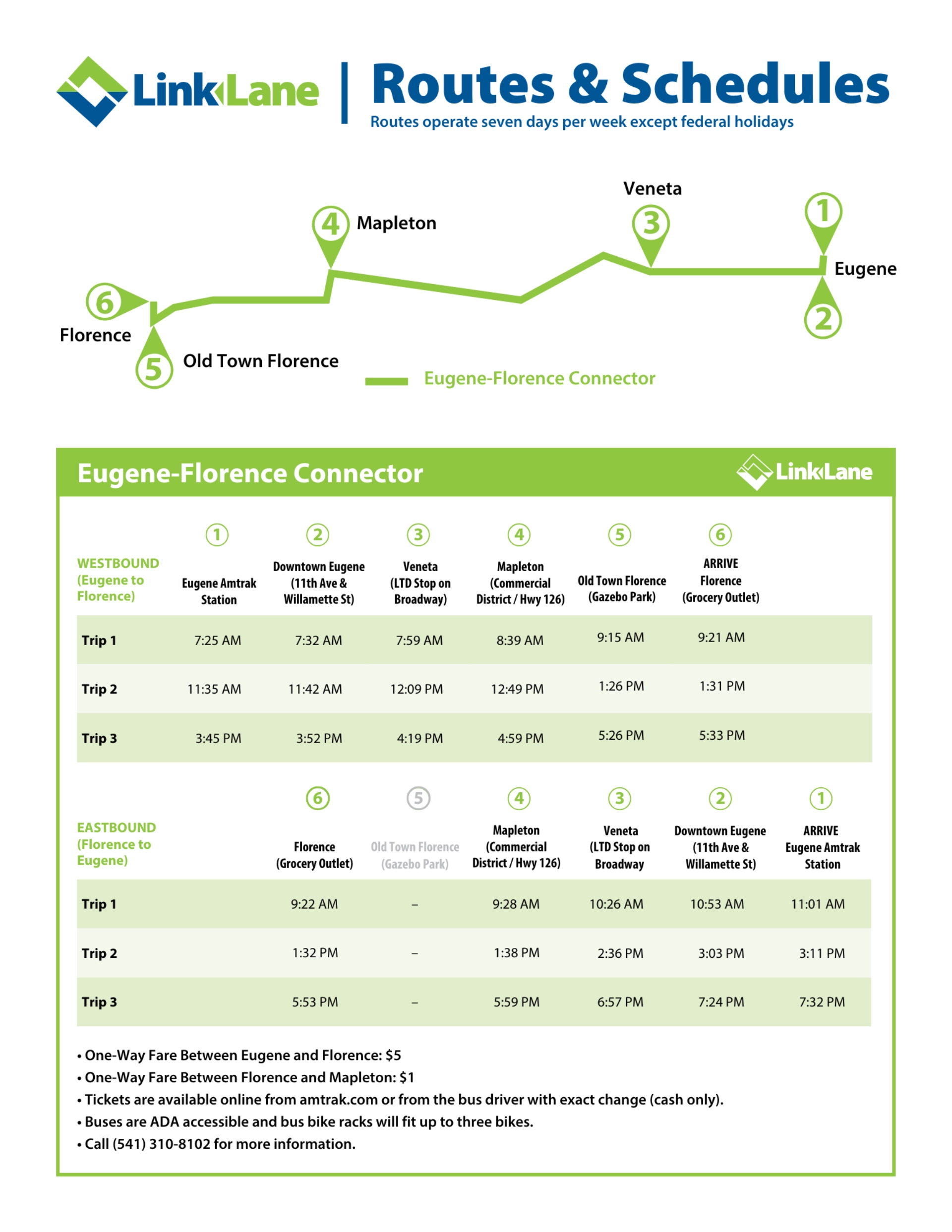 The 2025 Eugene Airport Link Lane Stop is defined by Link Lane’s Florence–Eugene Connector ending service to the Three Rivers Casino on October 31, altering routing for riders traveling to and from the airport.