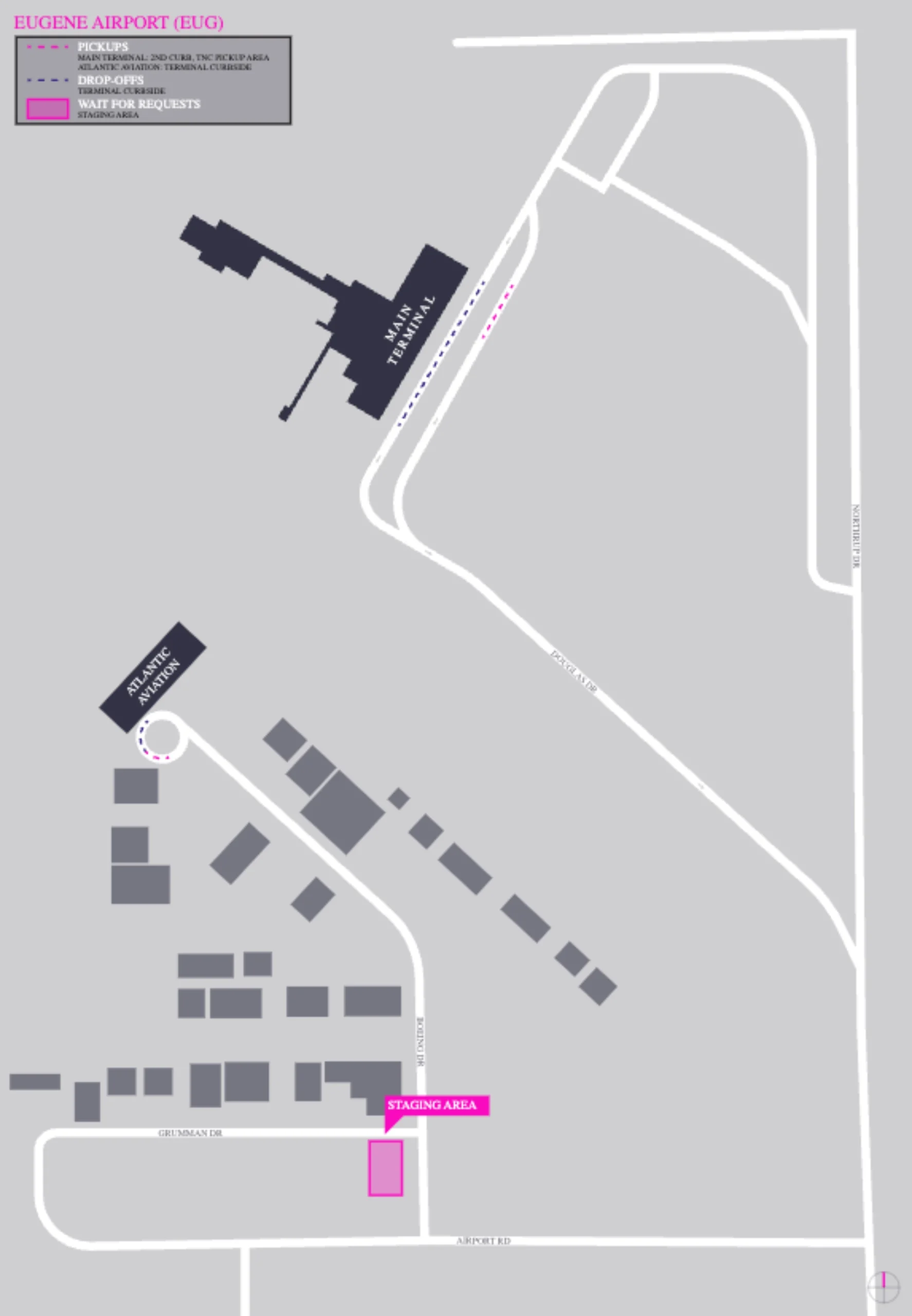 The Eugene Airport Ground Transportation Map clarifies pickup bays, rental-car access, and shuttle positions.