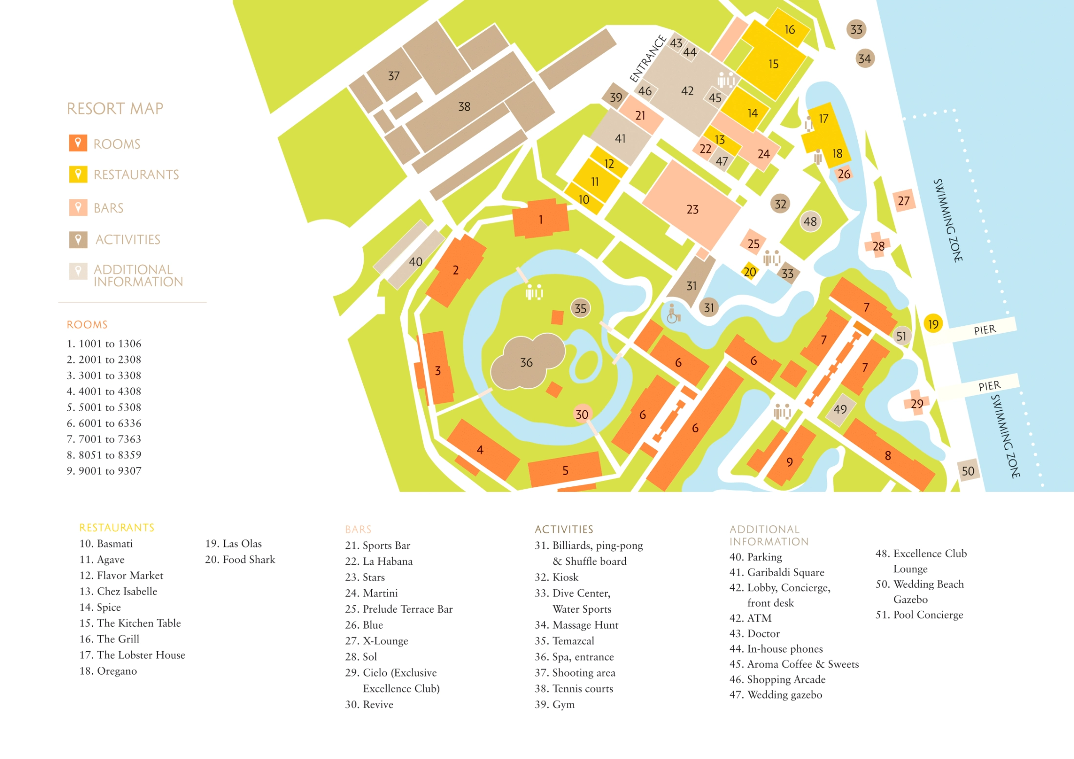 Use the map by first tracing the main spine from lobby through Garibaldi Square to the central pool and beach, then noting how the two accommodation wings branch north and south from that axis. Standard rooms dominate the quieter north and central blocks, while Excellence Club zones occupy the oceanfront tips and southern pool court. Plan stays by matching building position to your priorities for sun, quiet, pool energy, and quick dining access.