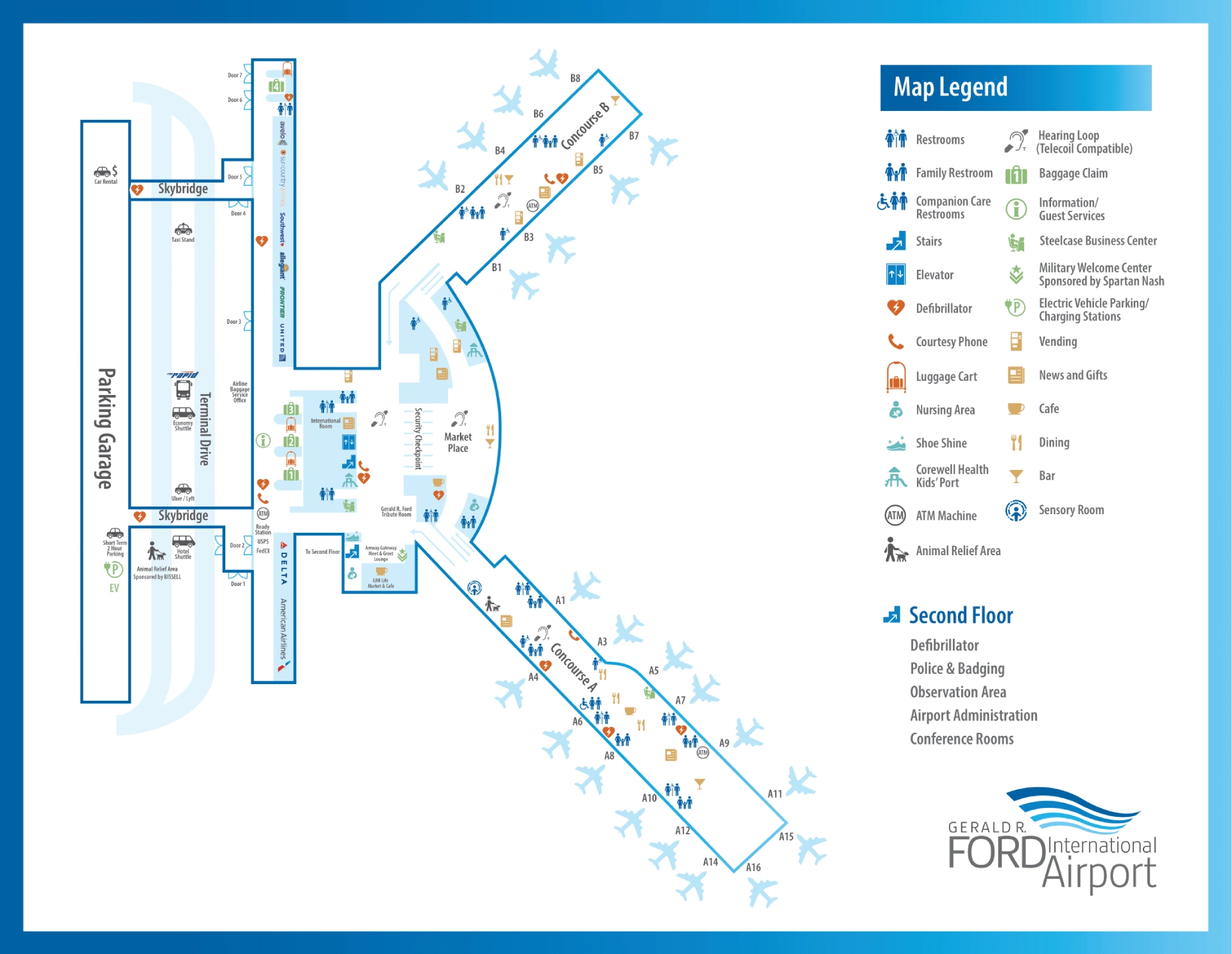 Use this Gerald R Ford International Airport Terminal Map to find gates, security, lounges, and parking with ease.