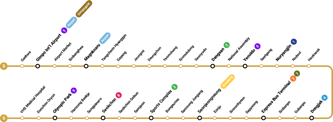 In 2025, Seoul Subway Line 9 at Gimpo International Airport operated with its express service running a 30-minute connection from Gimpo Airport Station to Express Bus Terminal Station, providing faster transit within the network.