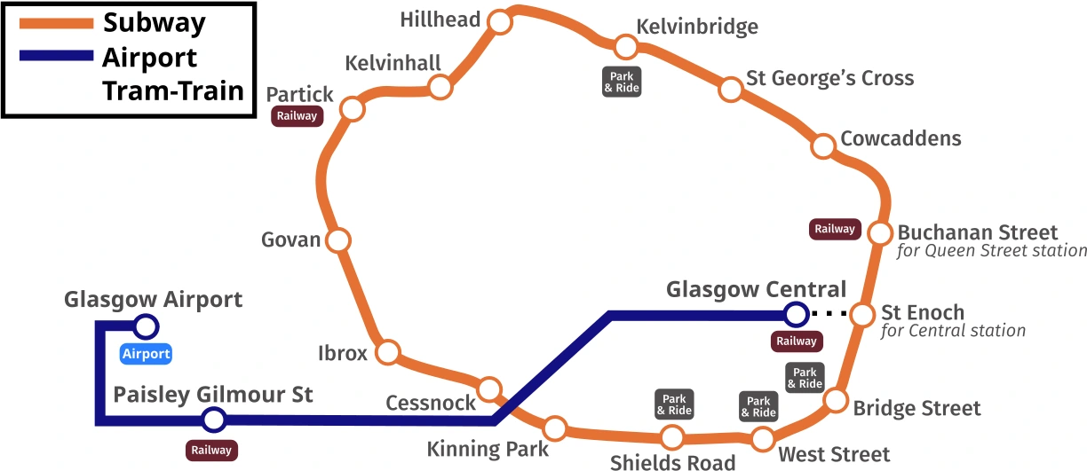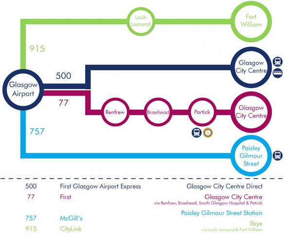The map shows local bus routes, airport express services, and nearby rail links that lead directly into central Glasgow. It’s your guide to navigating every transfer, from curbside to city.