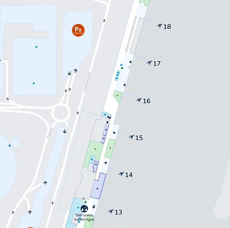 Use the map to trace walking paths between gate clusters, check security points, and locate parking entrances along Lentäjäntie.