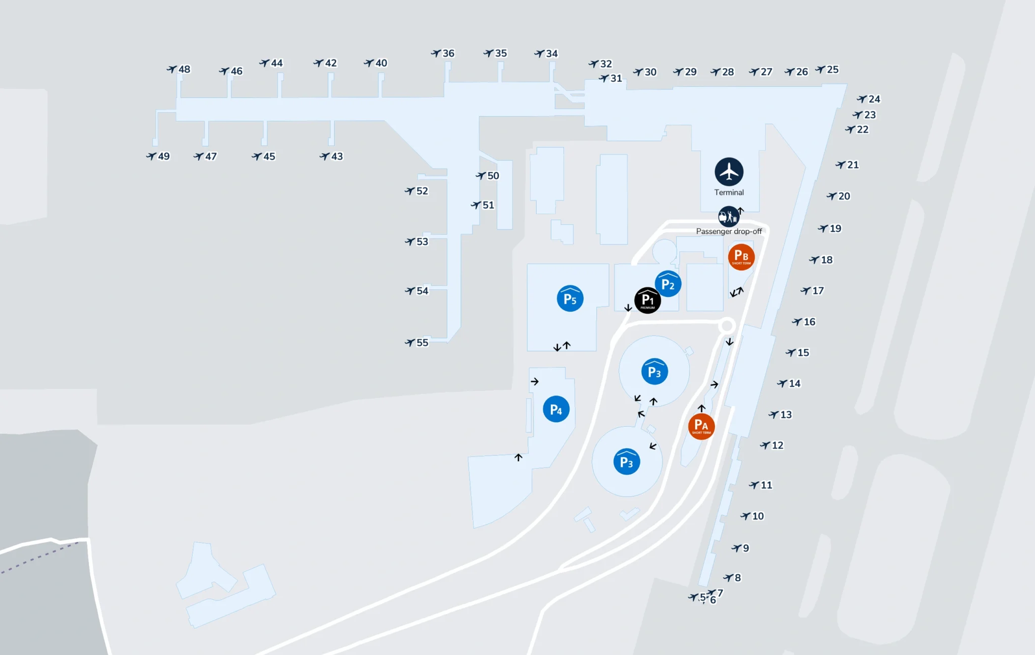 The parking areas are located near the terminal building for convenient access.