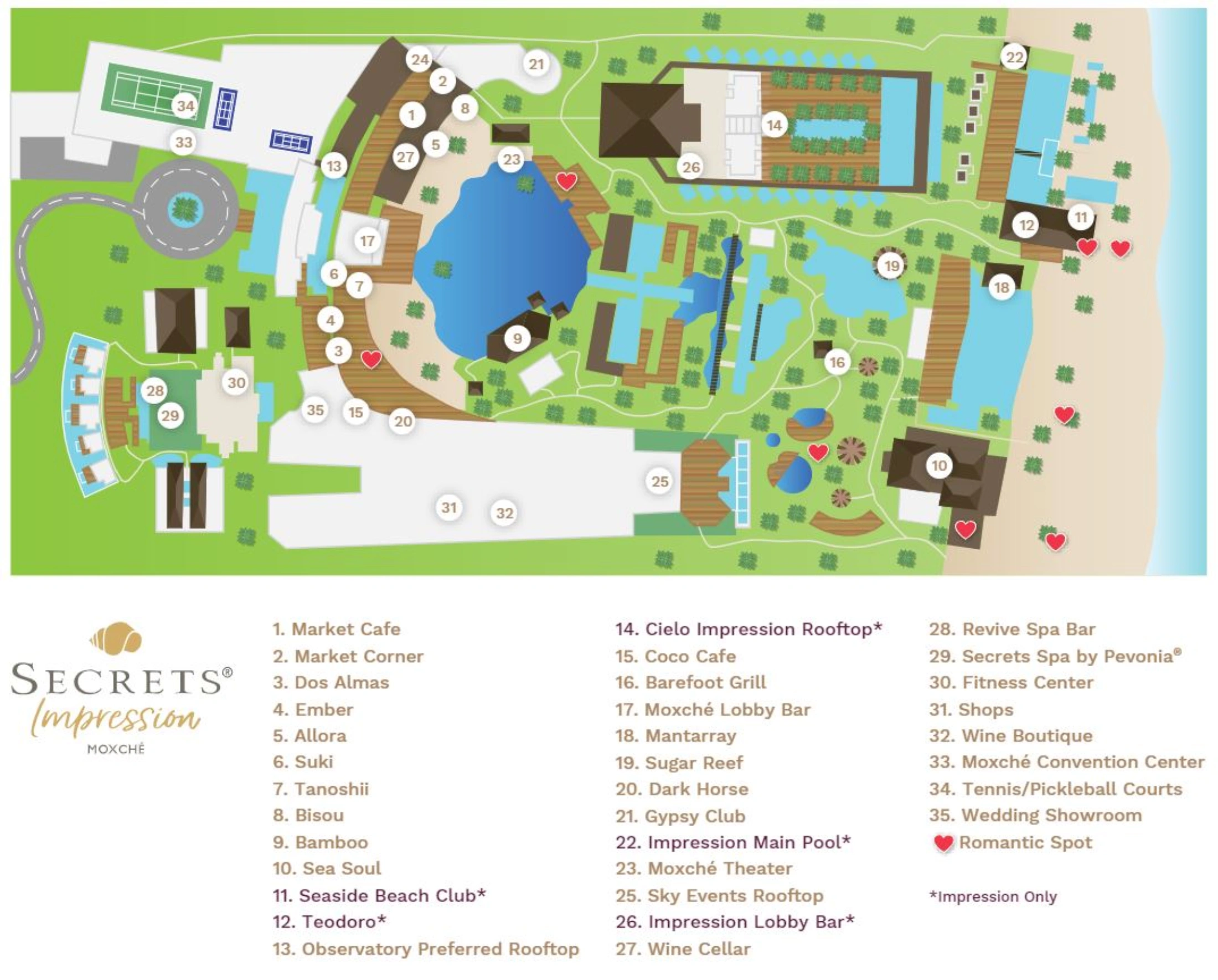 Use the map by thinking in three axes: inland to beach, north to south across the shared Secrets complex, and vertically within the Impression tower. Most daily movement is on foot along paved interior paths, with elevators handling changes between swim out levels, standard floors, and the rooftop deck. Quiet, romantic stays center on the tower, Cielo, cenotes, and Seaside pool, while more active trips lean toward the lagoon, sports bar, and theater areas.