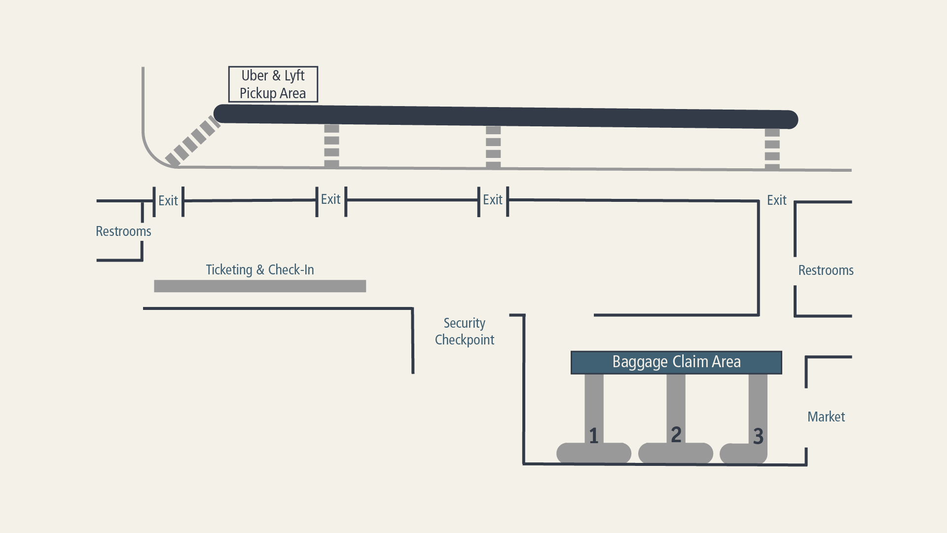 Road access is straightforward, and curbside signs help you track shuttles, taxis, and rideshare pick-up points without confusion.