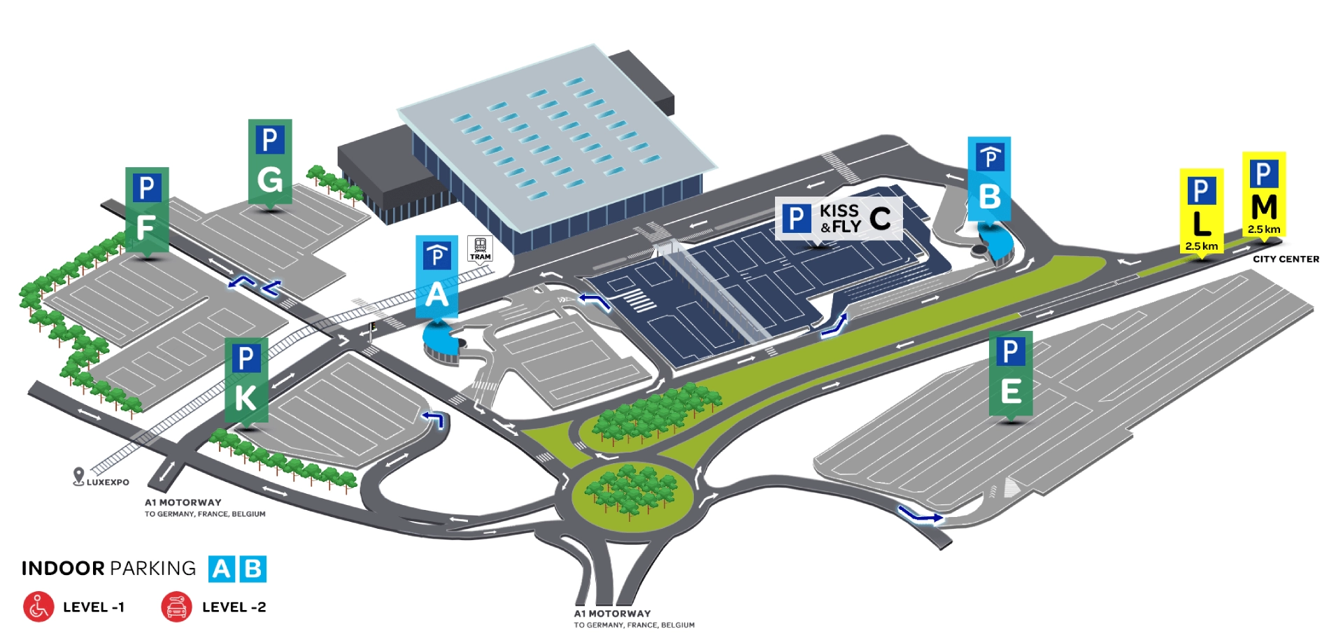 Luxembourg City Airport Parking Map easy to navigate and designed for convenience. Luxembourg Airport (LUX) offers a range of parking options located just outside the terminal.