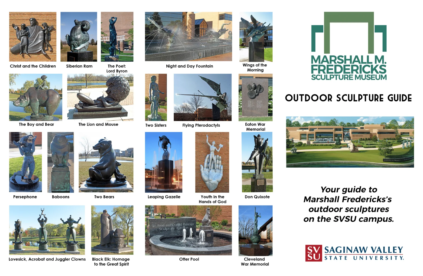 The Marshall M. Fredericks Sculpture Museum is located at Saginaw Valley State University in Michigan. It houses over 200 works by sculptor Marshall Fredericks, including bronze casts, plaster models, and public art. The museum emphasizes arts education, cultural enrichment, and the preservation of Fredericks’ legacy.