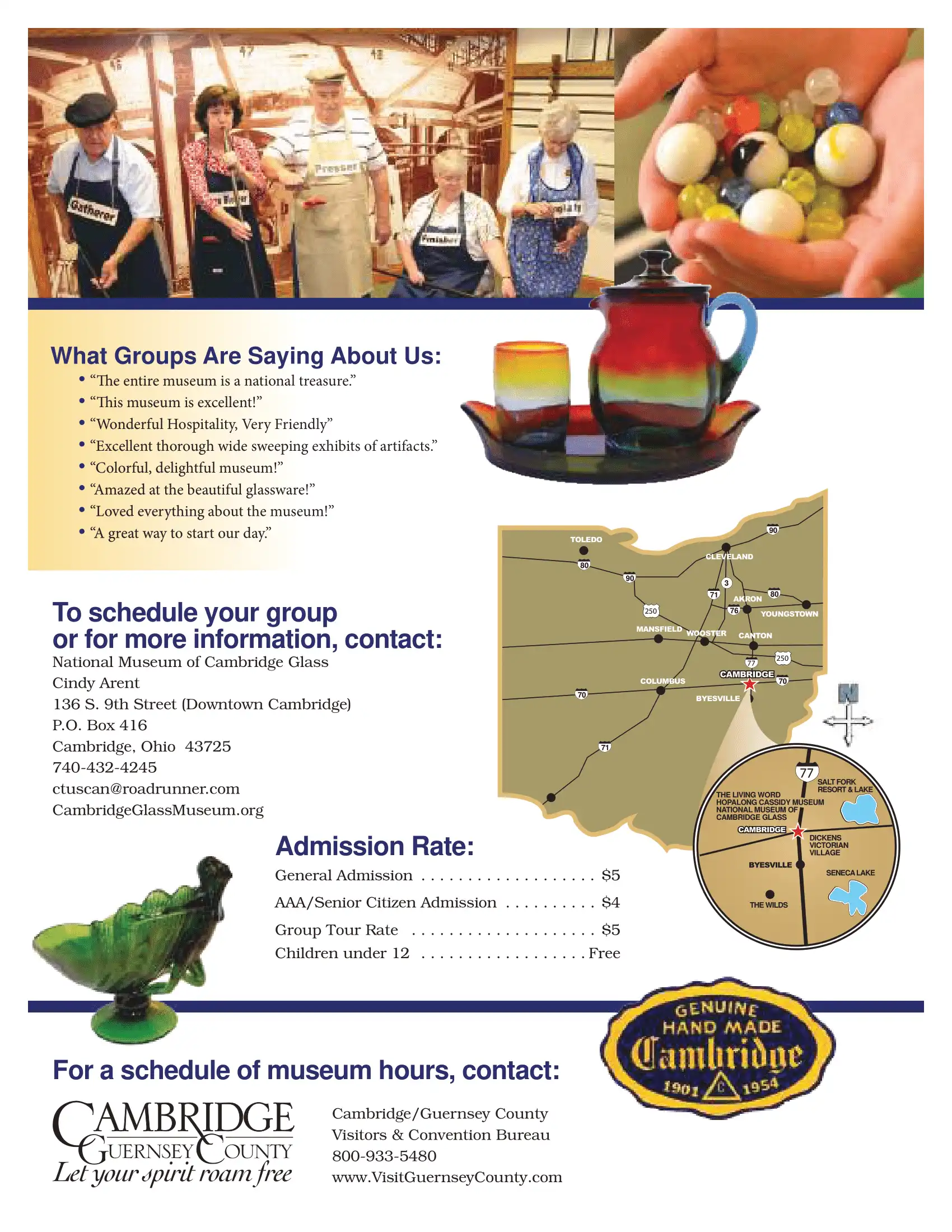 The most up-to-date National Museum of Cambridge Glass Map helps you navigate highlights like the elegant Etching Room, the Cambridge Colors display, and the glassmaking demonstration area.