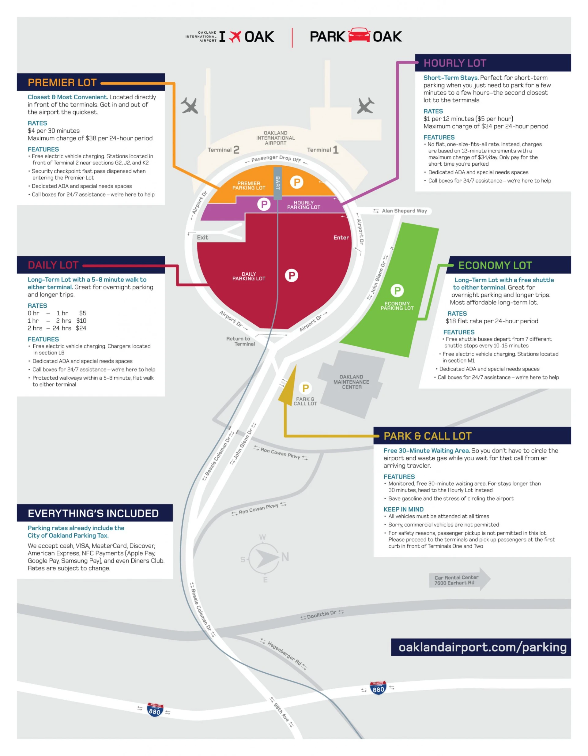In 2025, Oakland Airport introduced new parking rates effective July 1 that include the City of Oakland Parking Tax, with free electric vehicle charging stations added near Terminal 2.