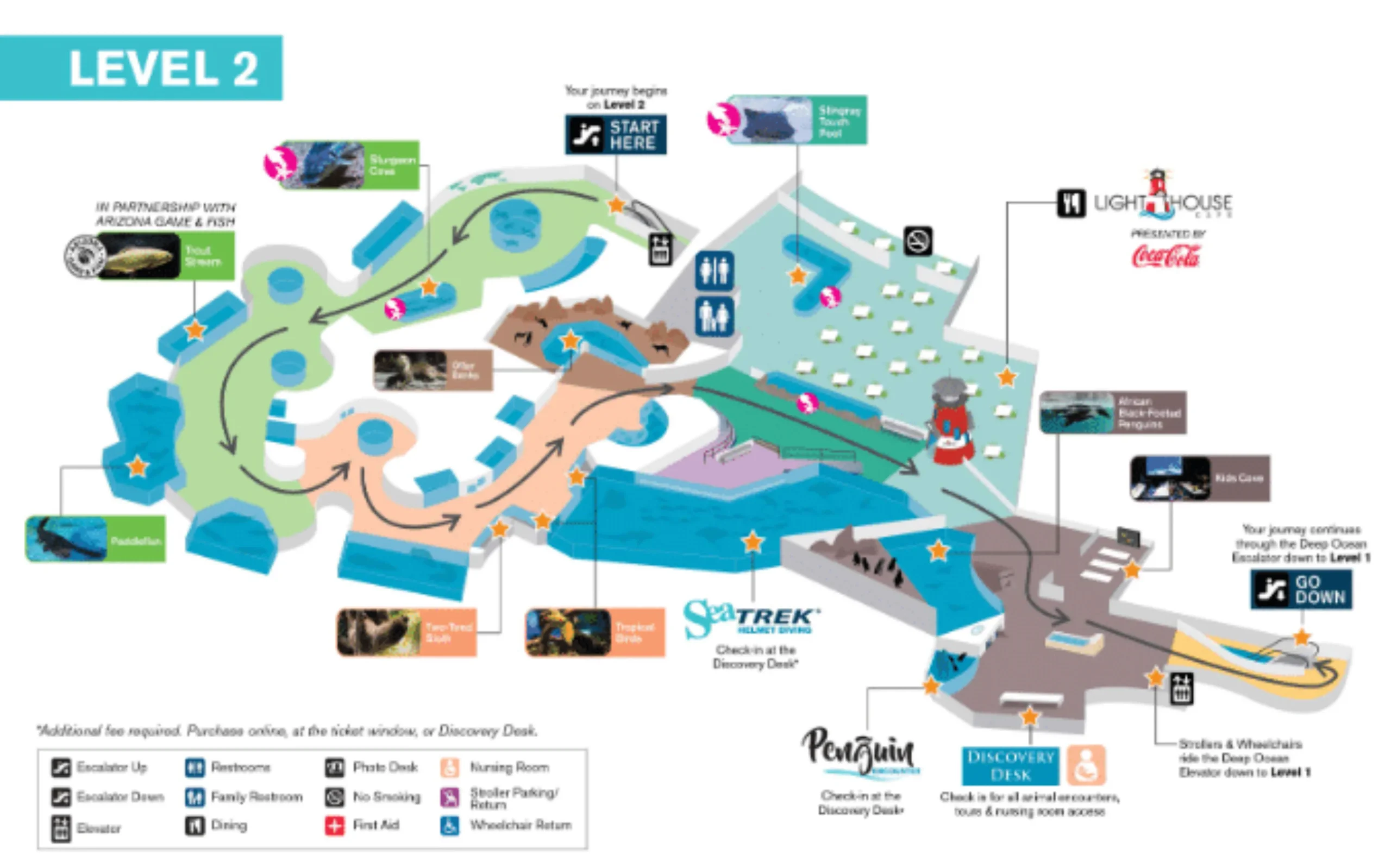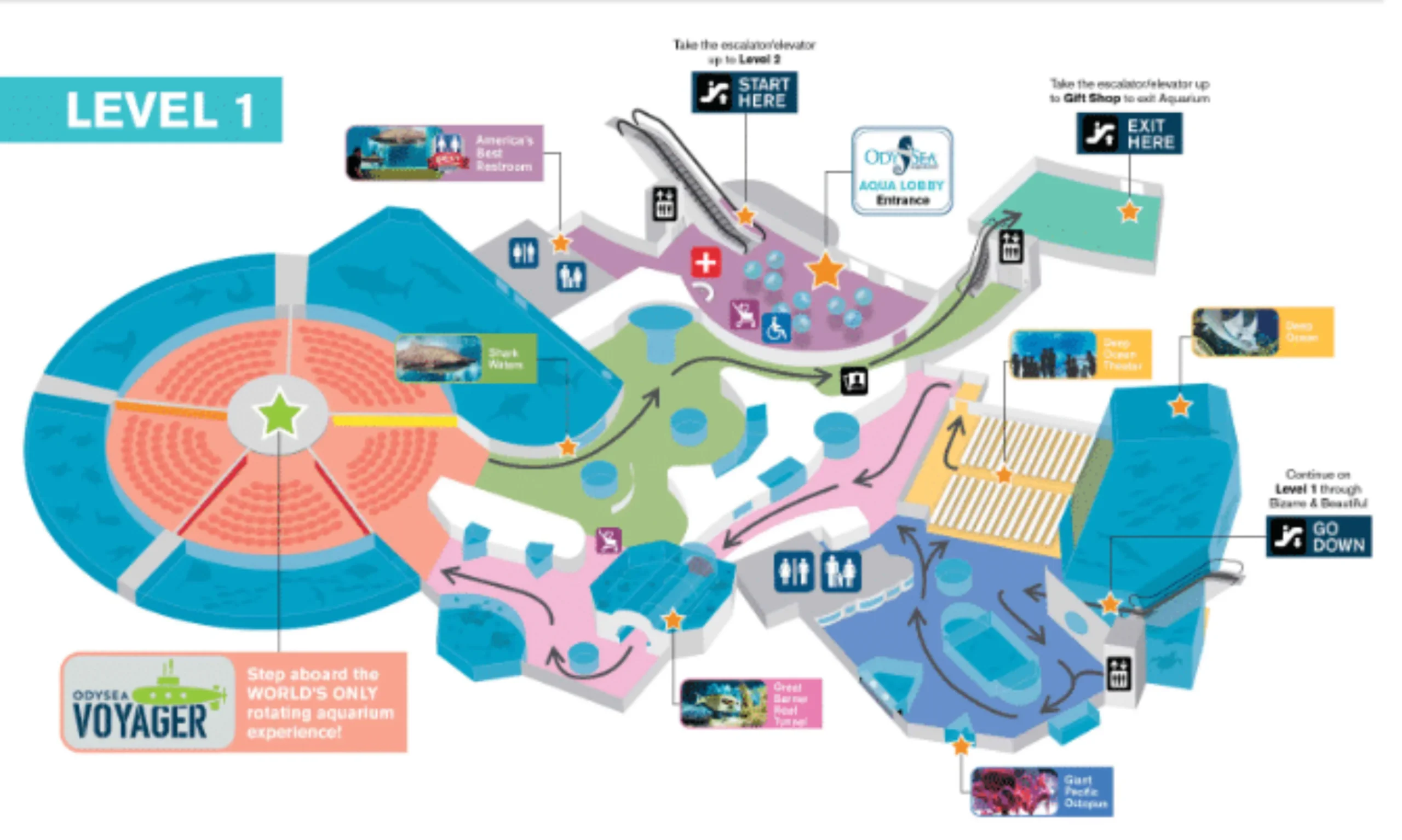 OdySea Aquarium Map 2021 updates included clearer navigation for the multi-level layout and enhanced signage to highlight unique attractions like the Voyager rotating theater and interactive touch pools. The map was updated to help guests easily locate popular exhibits such as Otter Banks, Penguin Point, and the Shark Bathrooms, ensuring visitors did not miss key experiences. These improvements aimed to streamline guest flow and maximize enjoyment of the aquarium’s diverse offerings.