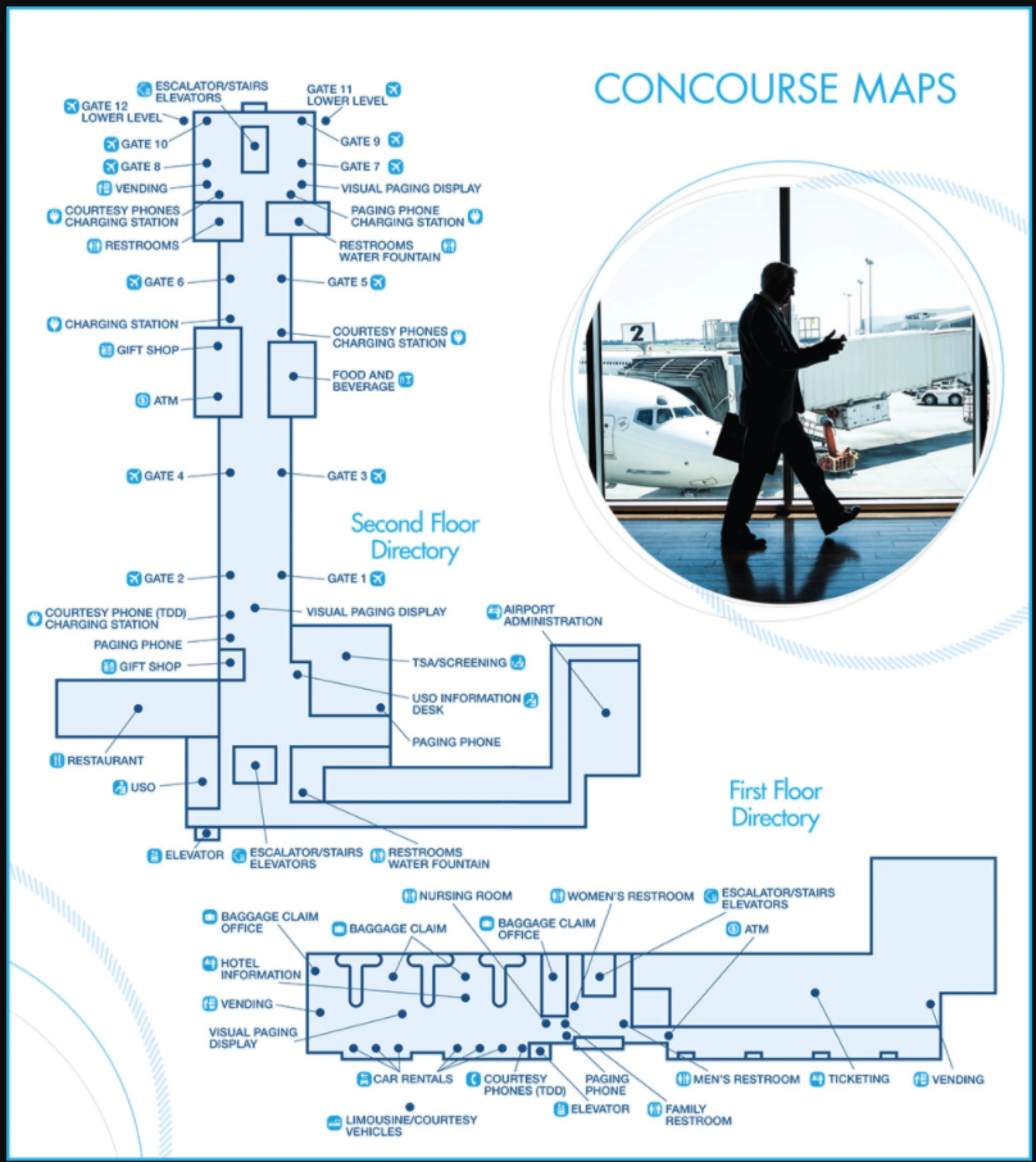 Use this Pensacola International Airport Terminal Map to find concourse gates, food options, lounges, and parking—follow the blue “Departures” or green “Arrivals” signs to move easily through the airport.